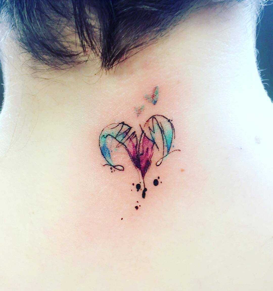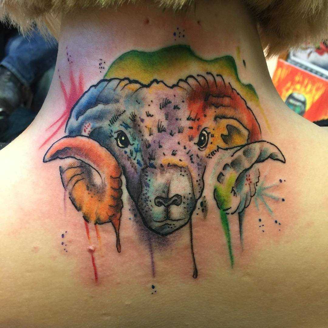 Тату Овен для девушек можно использовать в любой цветовой гамме, чем не могут похвастаться мужчины. Например, на шее, чуть ниже затылка, мастера часто используют стиль «акварель». Он изображается в понравившейся девушке цветовой гамме и выглядит довольно мило. Также девушкам доступно художественное изображение выбранной татуировки.