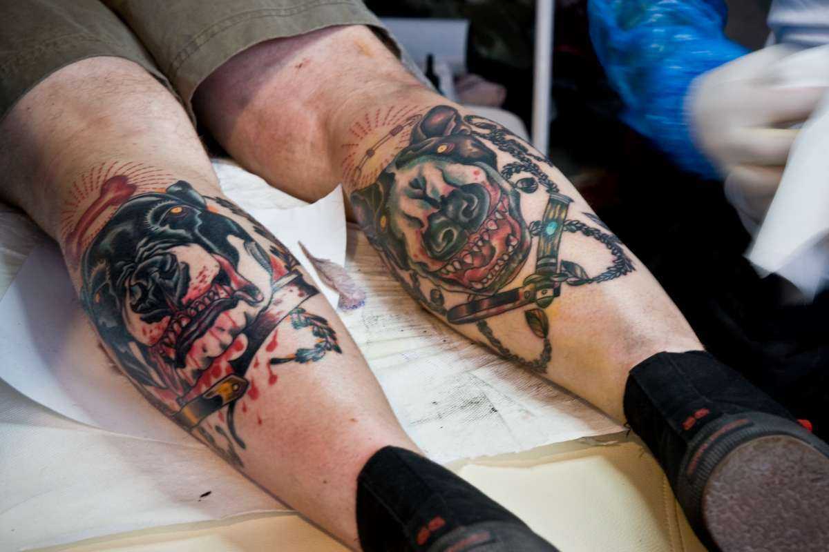 При выборе места тату на ноге мужчины долго не выбирают, останавливая свой выбор на икрах. Икры – это популярное место для нанесения изображений, которое стало использоваться не так давно. Подобные татуировки могут наносится как на одну из ног, так и на обе одновременно. При создании парного рисунка используют единый сюжет, который разделяется на две ноги. Также можно использовать разные тату, выполненные в одном стиле. Так как эта часть тела не особо чувствительна к боли, то можно использовать большой рисунок, набитый на всю голень.