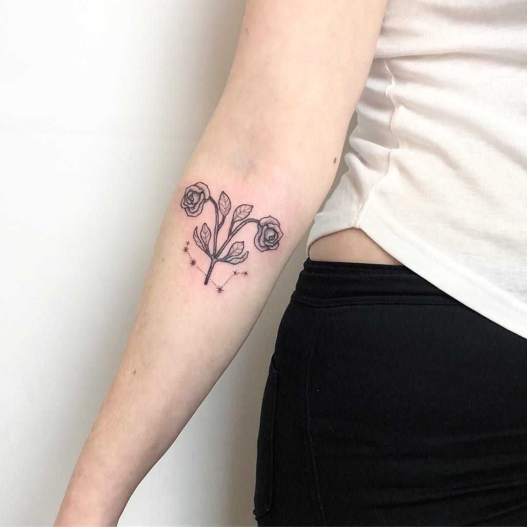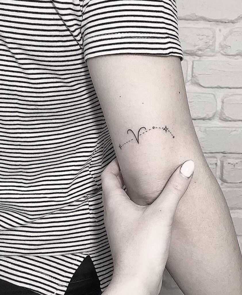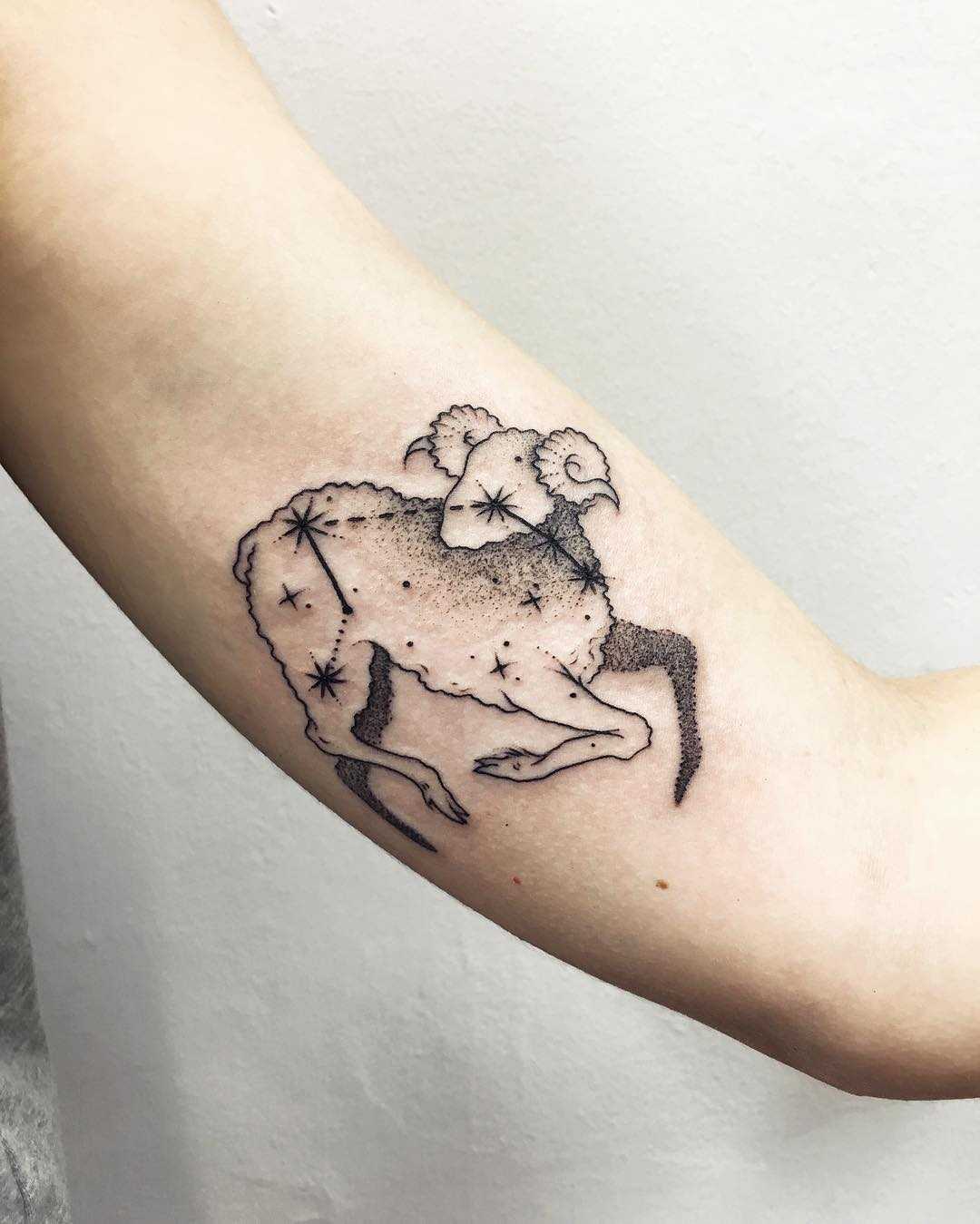 Для тех девушек, которые не хотят располагать на своем теле крупные тату, отличным решением станут эскизы с созвездием. Созвездие Овна включает в себя три основные звезды. На эскизе они обычно соединяются линией и дополняются такими изображениями как горы, млечный путь и т.д. Татуировка с созвездием красиво смотрится на запястьях, на ключице, на руке выше локтя.