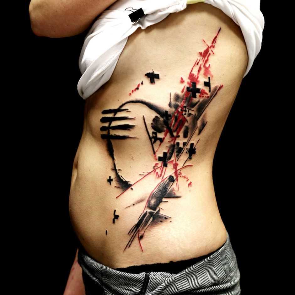Для трэш польки лучше всего использовать грудь. Так как идея стиля – это протест, то грудина подходит, как ничто другое. Эскиз уместен любой из типичных для направления.