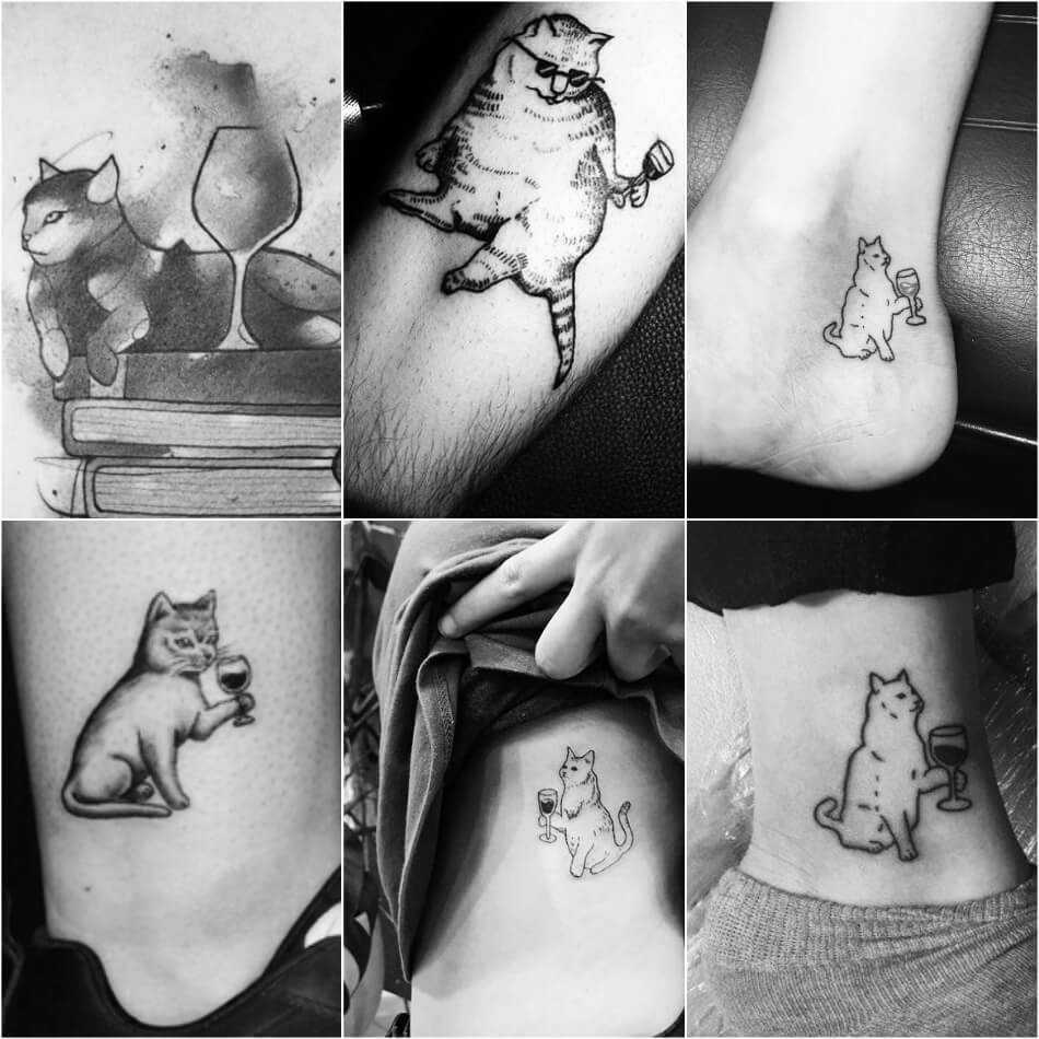 Сюжет тату кот с бокалом вина стал популярен в последние пару лет благодаря моде на интернет-мемы. Такой кот является ироничным символом современного человека. Самостоятельный, гордый, одинокий, поднимающий гордо бокал.