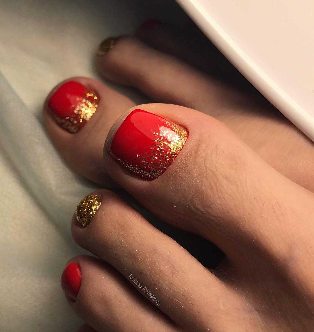 Дизайн выглядит броско и ярко, поэтому выполняйте его по случаю торжественного или другого важного события. Красно-золотой педикюр будет совсем неуместно смотреться в летних образах