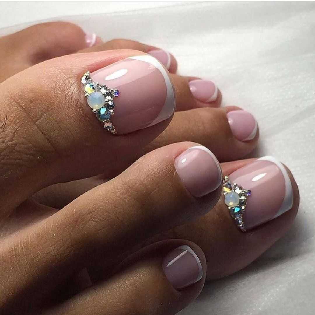 Более сдержанно и гораздо нежнее будет выглядеть педикюр с незамысловатыми узорами, выложенными из цветных стразов маленького размера одного цвета у оснований ногтей больших пальцев.