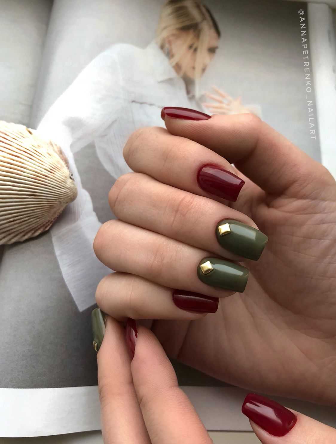 Комбинация оливы с вишневыми оттенками кажется нестандартной и тяжелой. Но если дополнить белыми деталями, то маникюр получится значительно веселее. А вот сочетание цветов с черным наоборот – придаст респектабельности. Подойдет для женского образа более старшего возраста.