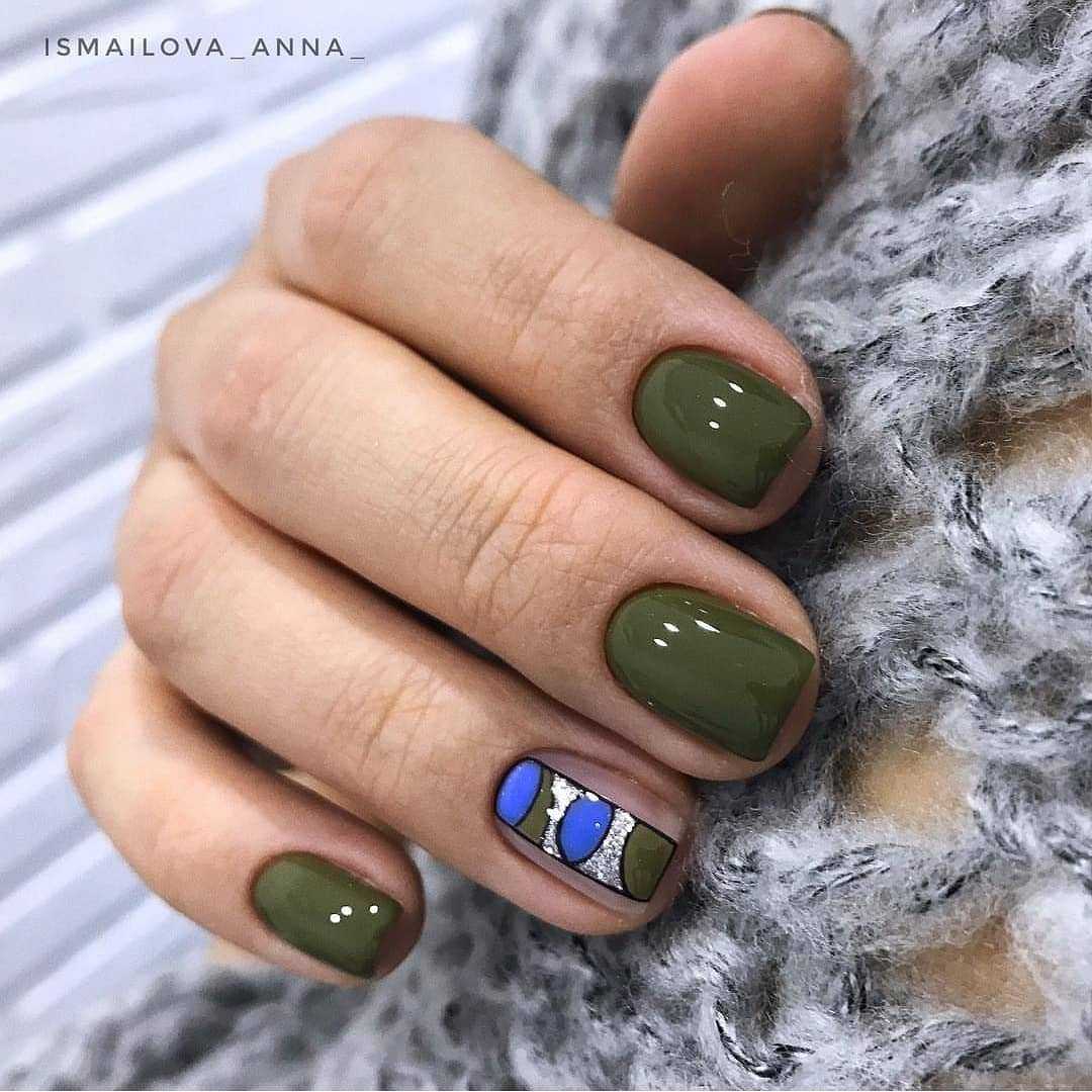 - выделение одного или двух пальчиков улыбкой цвета хаки, остальные ноготки можно составить в стиле нюд или покрасить полностью в сходный, контрастный оттенок;
