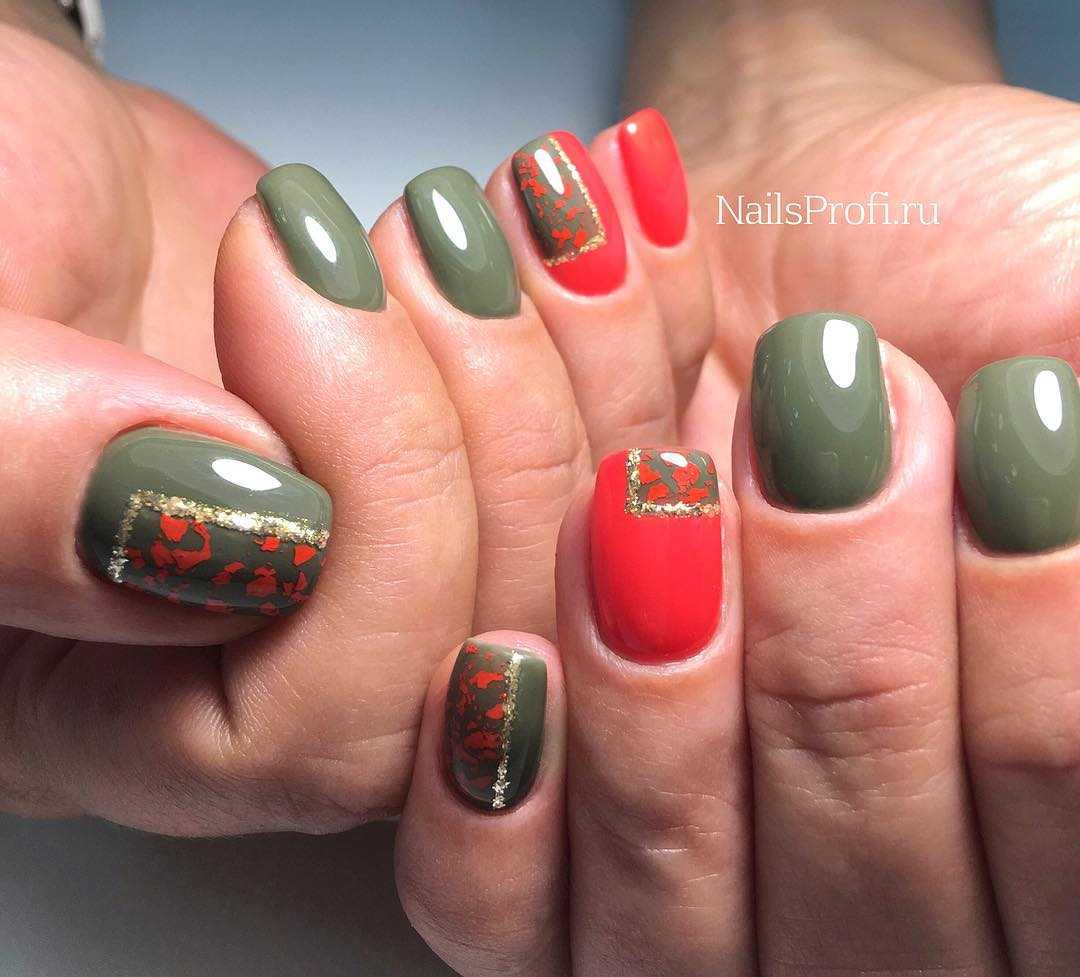 Алый маникюр с оливковыми деталями является броским и подойдет не каждому образу. А вот если оформить ногтевую пластину болотным и нарисовать красные цветы, то в таком случае дизайн получится более нейтральным. Причем цветочный орнамент не стоит использовать на всех пальцах. Пусть нейтральное качество цвета таковым и остается.