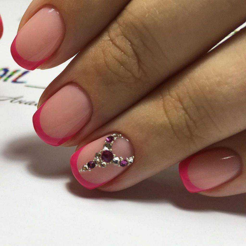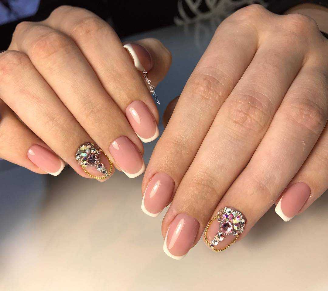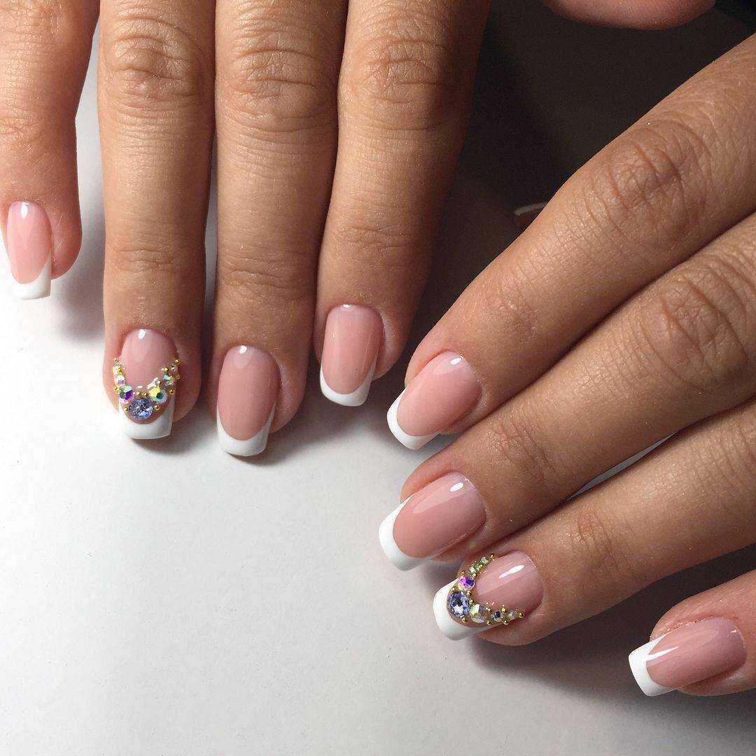Новинок достаточно много: мармелад, камифубуки, чешуя, разнообразные металлизированные пигменты, блестки ,витражные лаки, гель-лаки с эффектами и т.д. Сейчас у nail-мастеров просто невероятное разнообразие инструментов для создания самых интересных и необычных вариантов маникюра, в том числе френча. Разработано множество техник, которые смело сочетают в одном дизайне, делая комбинированный маникюр. Увлекательное разнообразие ярких камушков, блесток и наклеек притягивает, как магнит и заставляет постоянно работать безграничную фантазию мастеров по маникюру. Начнем обзор свежих вариантов дизайна френч с уже полюбившейся новинки — новой формы дизайна ногтей со стразами — инкрустацией.