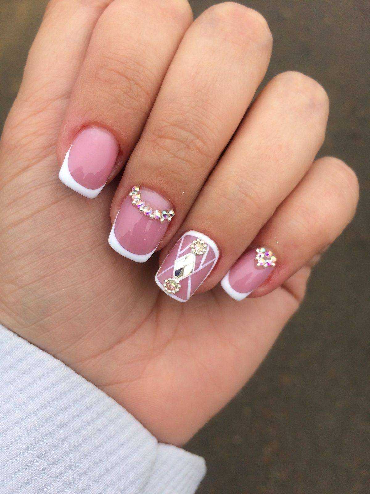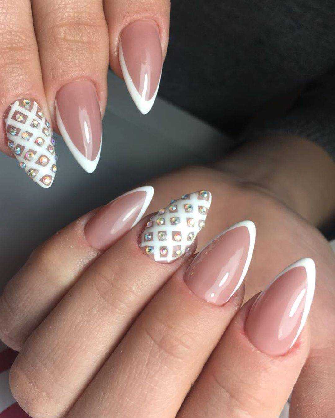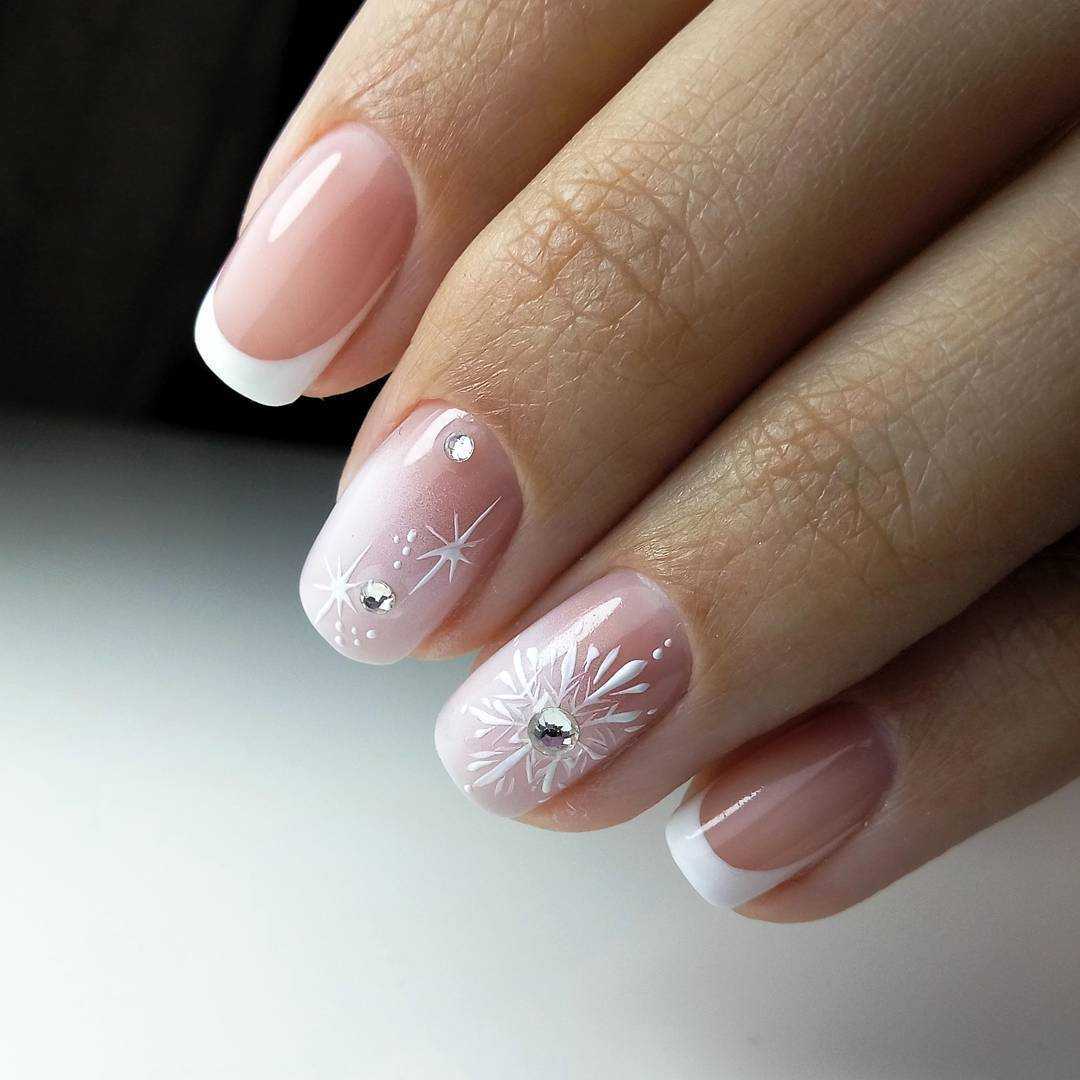 Новинок достаточно много: мармелад, камифубуки, чешуя, разнообразные металлизированные пигменты, блестки ,витражные лаки, гель-лаки с эффектами и т.д. Сейчас у nail-мастеров просто невероятное разнообразие инструментов для создания самых интересных и необычных вариантов маникюра, в том числе френча. Разработано множество техник, которые смело сочетают в одном дизайне, делая комбинированный маникюр. Увлекательное разнообразие ярких камушков, блесток и наклеек притягивает, как магнит и заставляет постоянно работать безграничную фантазию мастеров по маникюру. Начнем обзор свежих вариантов дизайна френч с уже полюбившейся новинки — новой формы дизайна ногтей со стразами — инкрустацией.