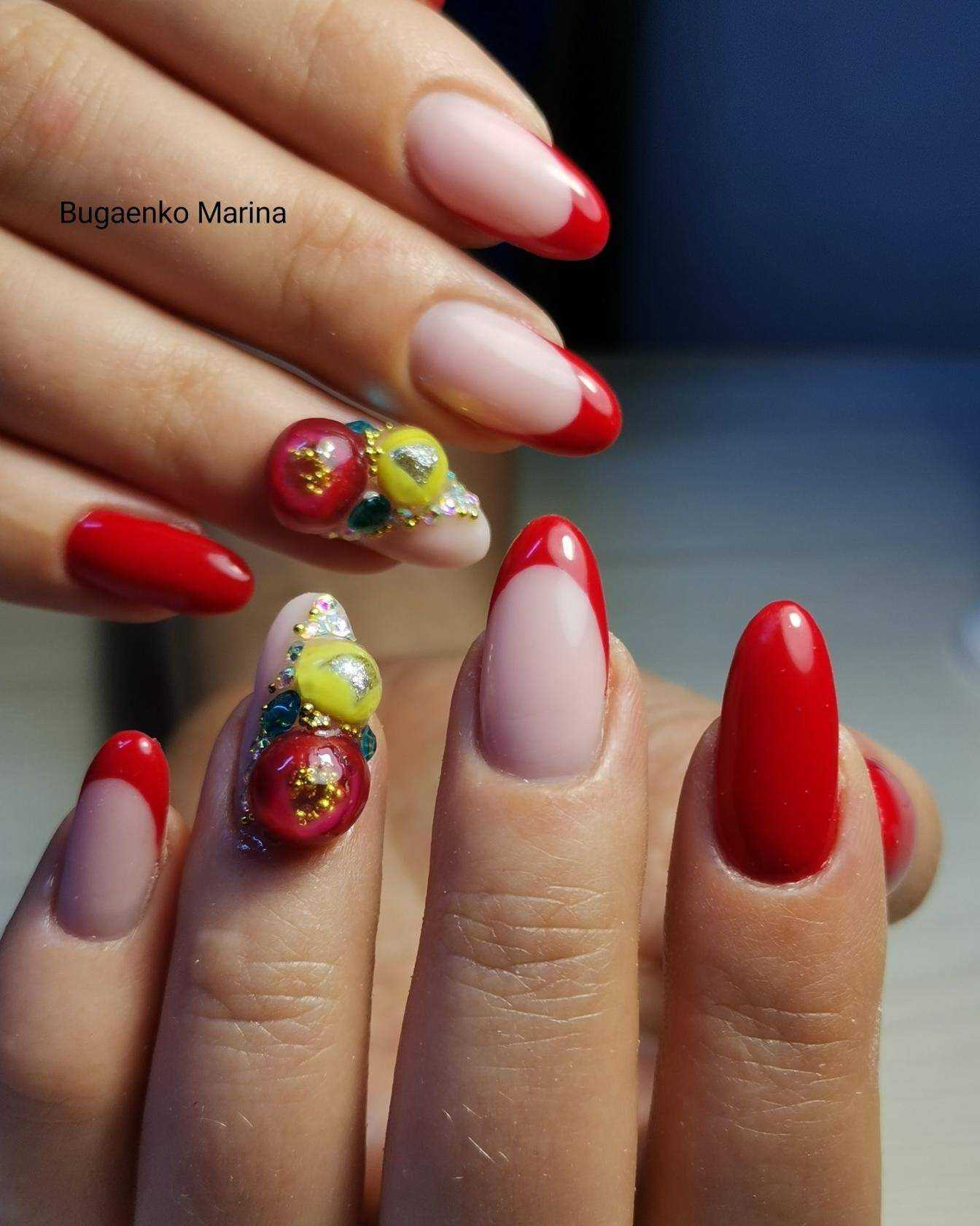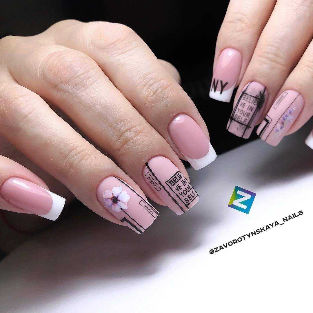 Модный френч с рисунком — это абстракция на ногтях, текстурные рисунки, геометрия и цветочные принты в разном исполнении (акварельная техника и объемные рисунки гель-пастой). Идеи для выполнения френча гель-лаком с рисунком можно черпать и из сезонных мотивов. Сейчас в моде осенний дизайн «зонтики», летний маникюр с различными насекомыми и ягодками и зимние рисунки в виде объемных елочных шаров.