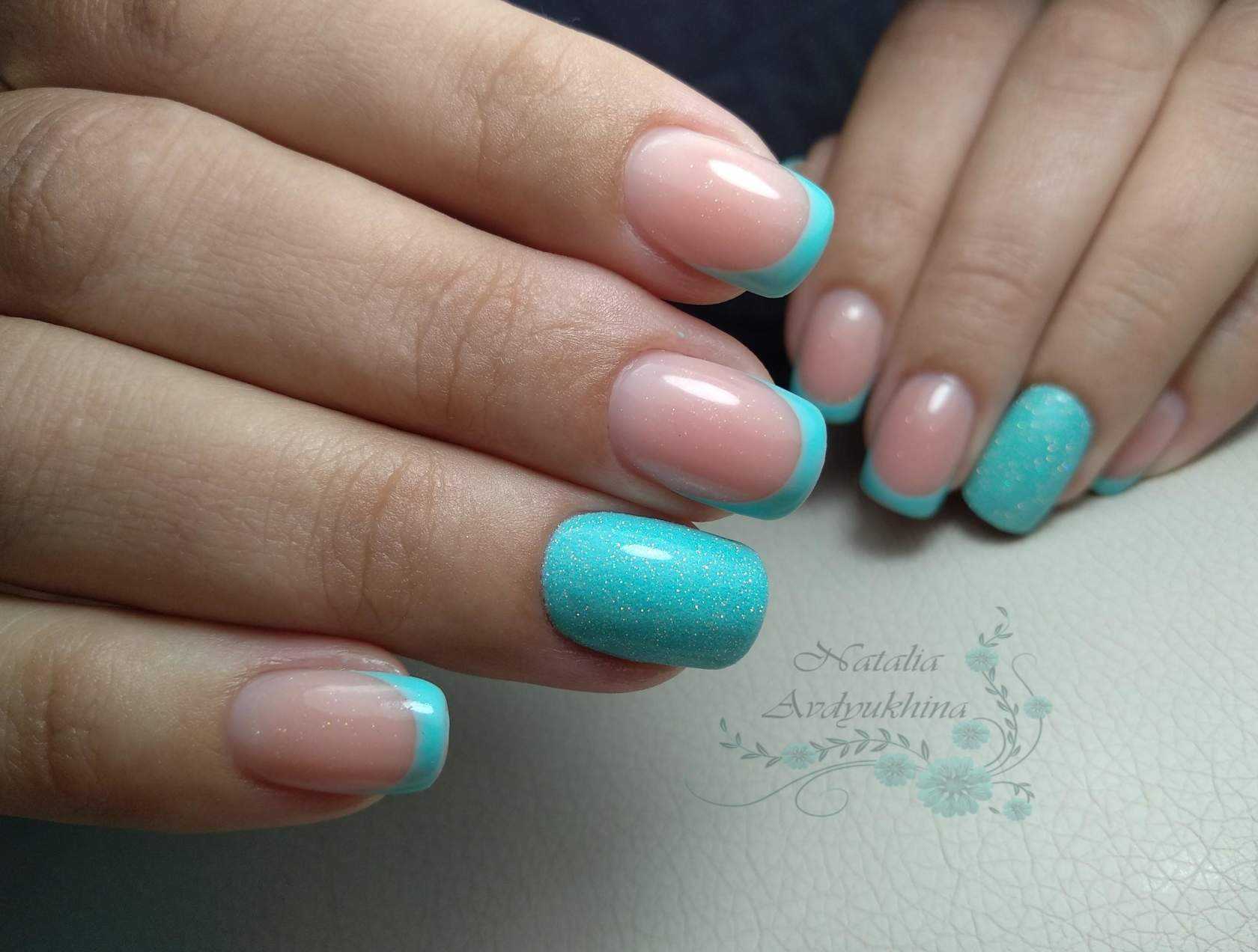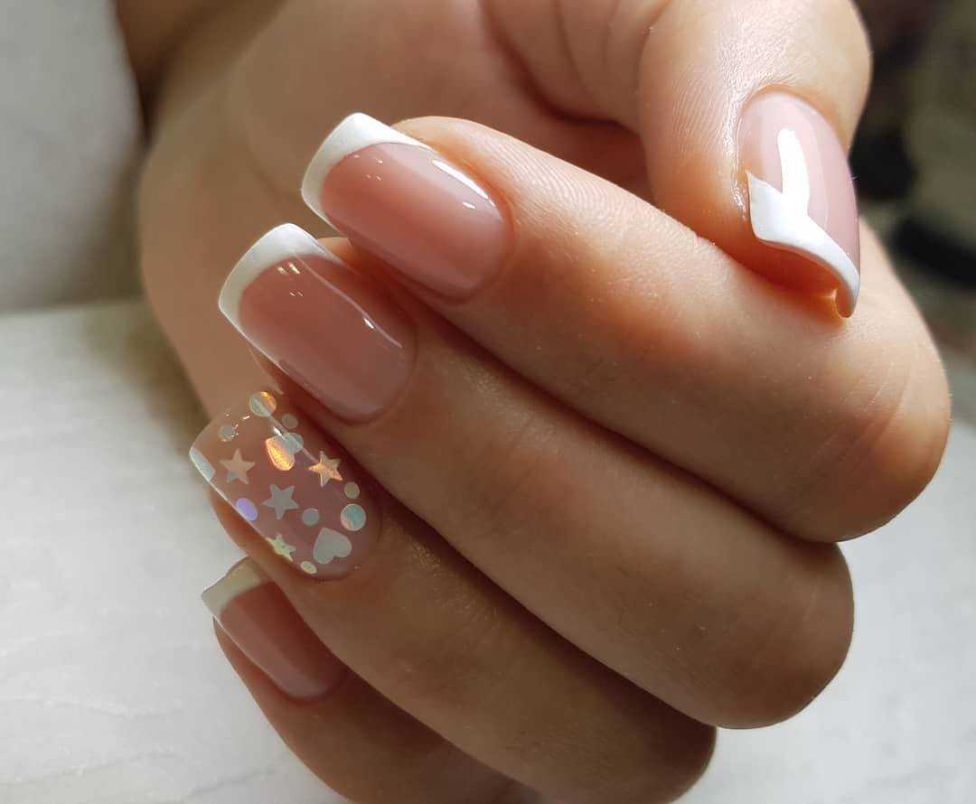 - френч с блестками — сияющие частицы можно заложить в основу или в финишное покрытие.