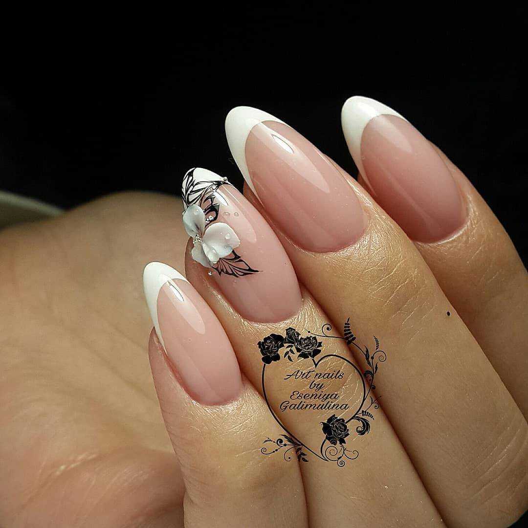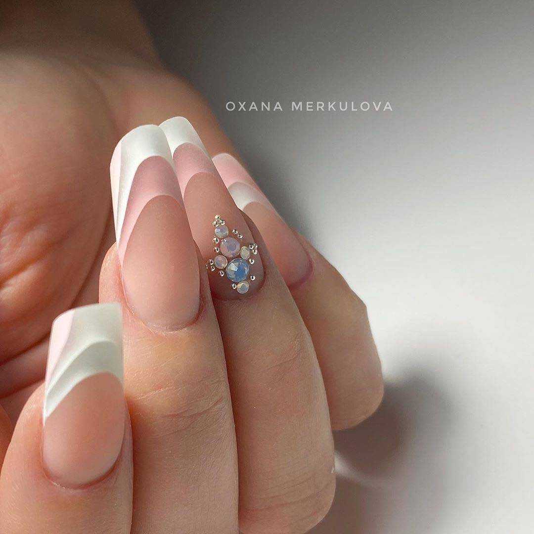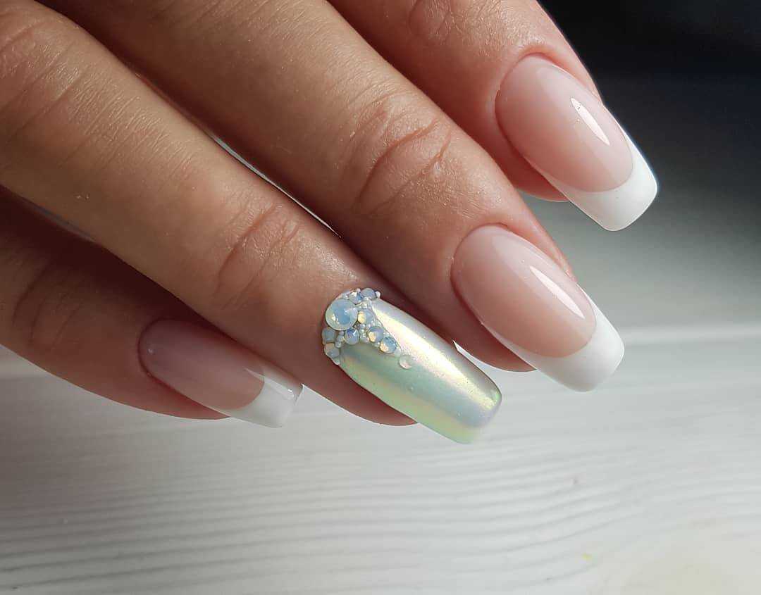 Одним из самых популярных цветов модного френча 2020 будет белый. Белый маникюр выглядит на ногтях любой формы достаточно аристократично. Его иногда еще разбавляют золотыми бликами фольги или блесток, а также сочетают с зеркальной втиркой.
