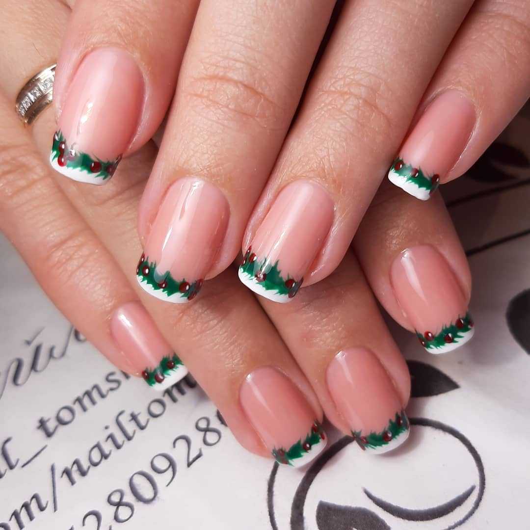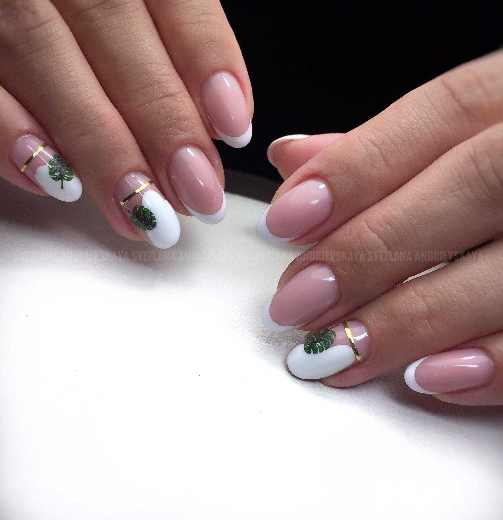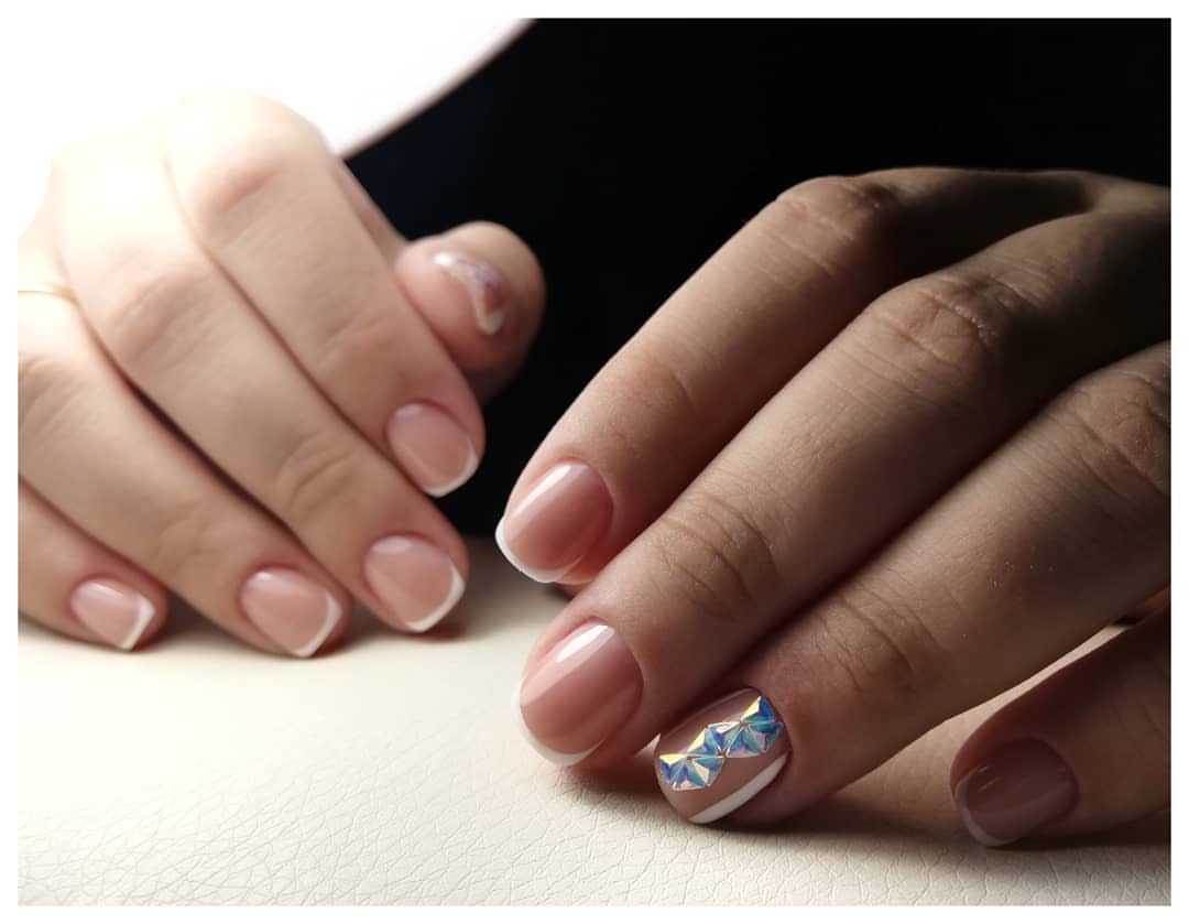 - французский маникюр — неширокая белая полоска по краю ногтя;