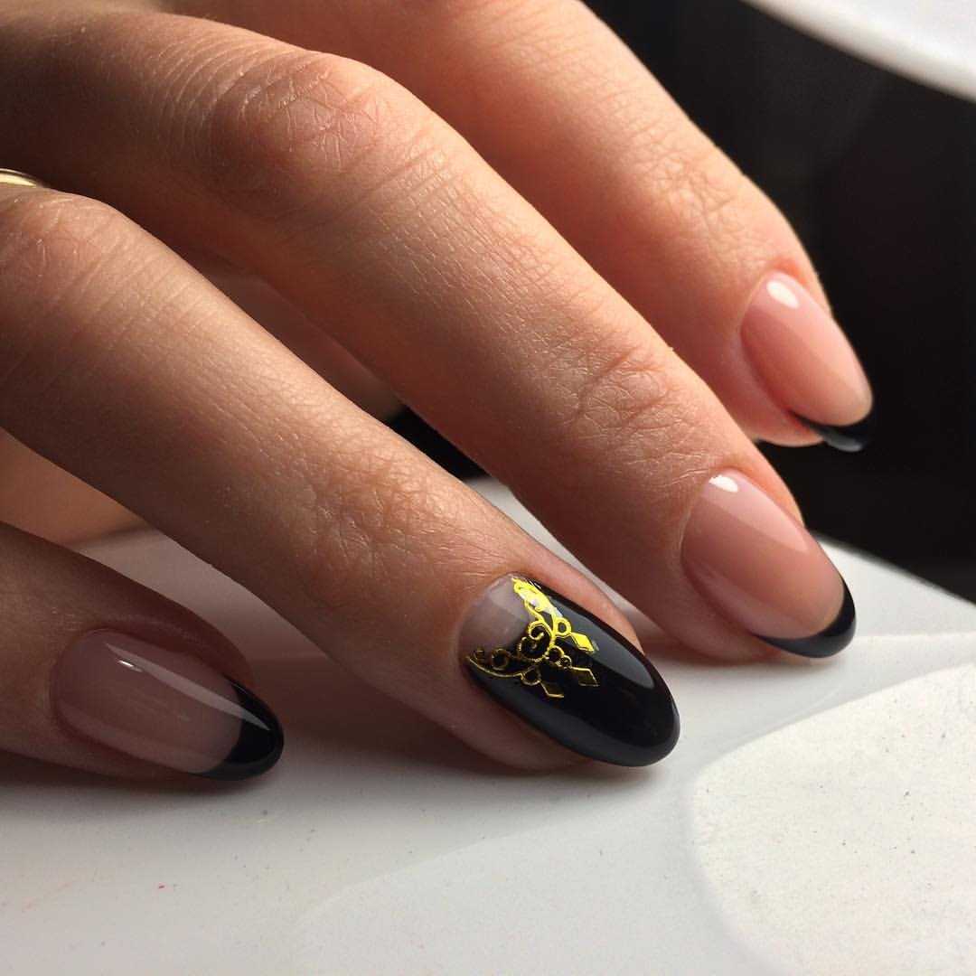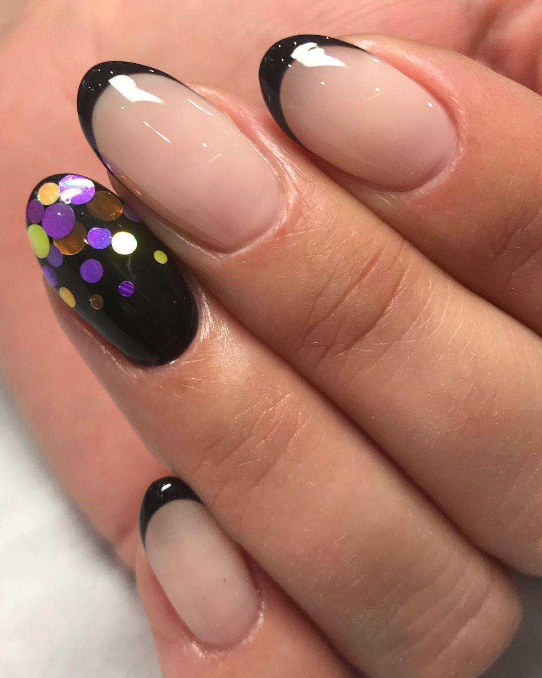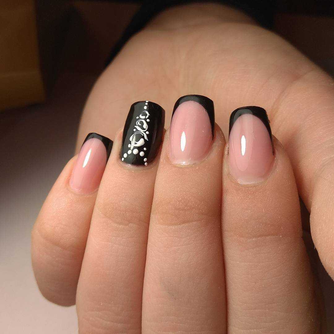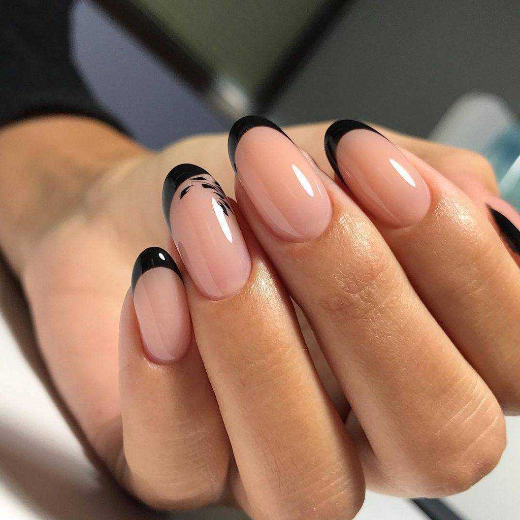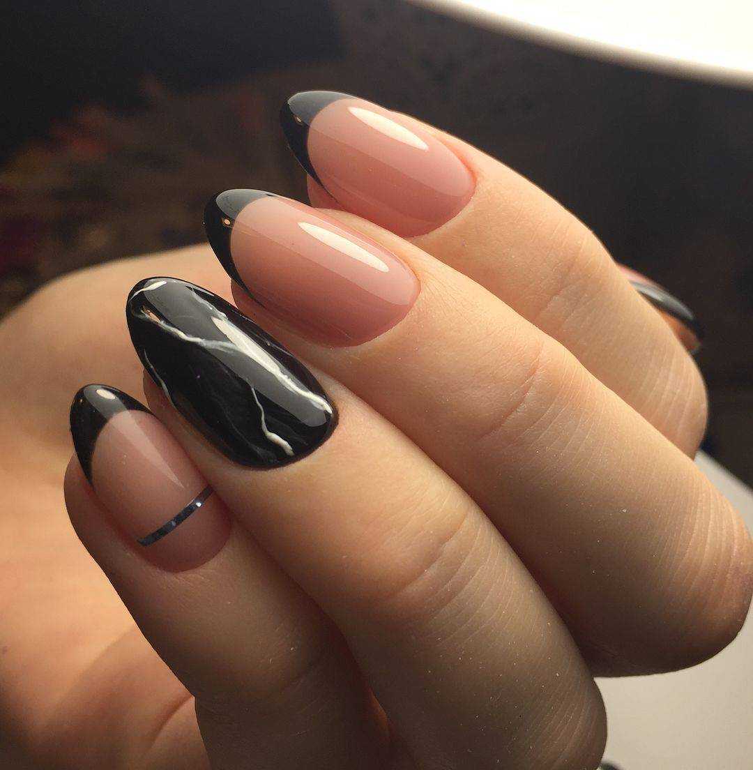 Еще одним самым популярным вариантом френча является матовое или глянцевое черное покрытие ногтей с блестками или негативным пространством. Линия улыбки также может быть выделена с помощью втирки или глянцевого топа.
