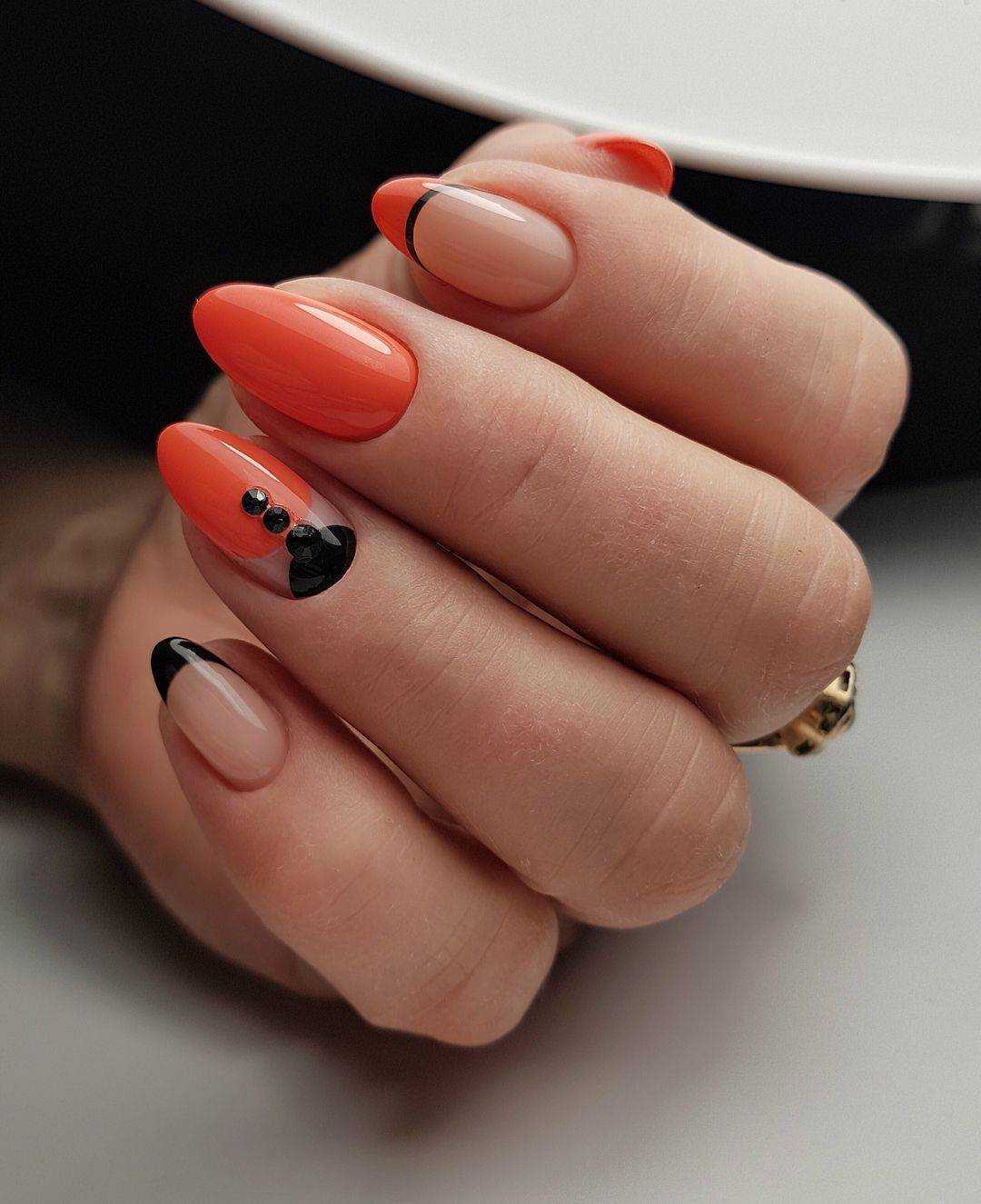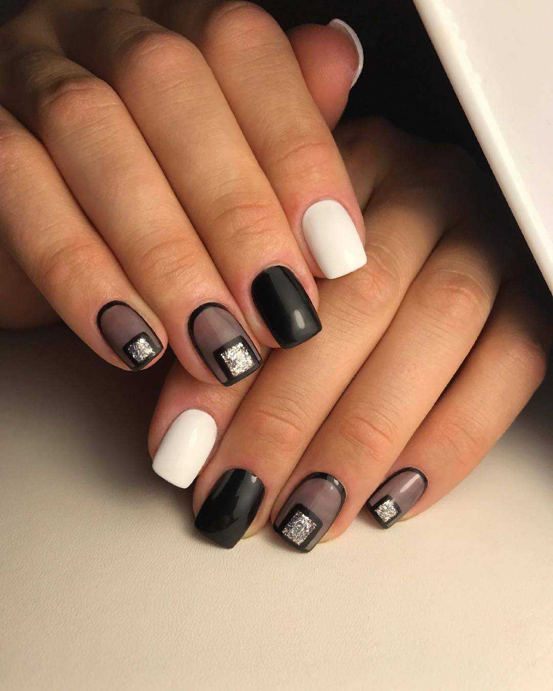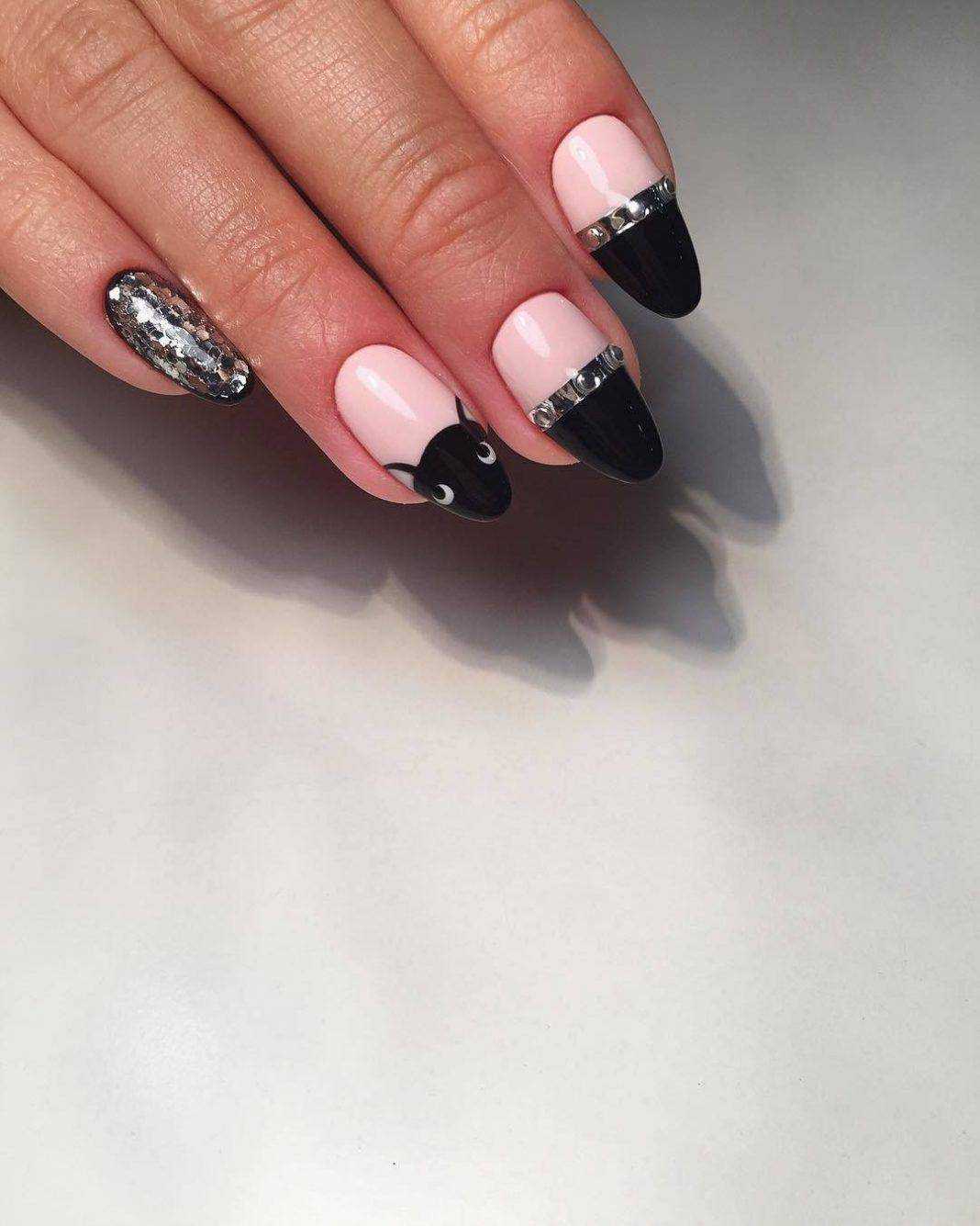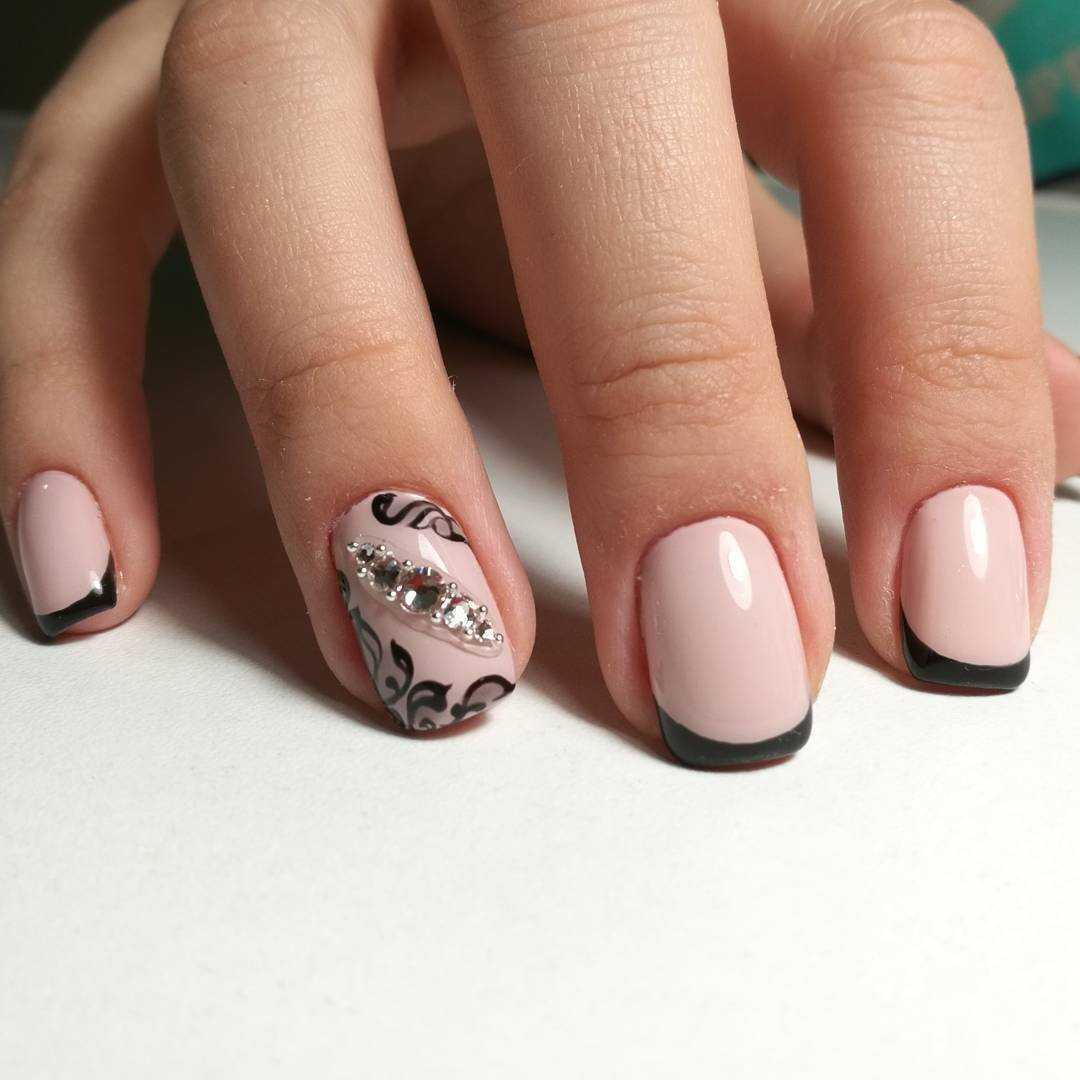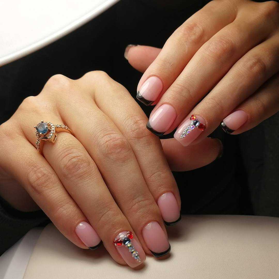 Еще одним самым популярным вариантом френча является матовое или глянцевое черное покрытие ногтей с блестками или негативным пространством. Линия улыбки также может быть выделена с помощью втирки или глянцевого топа.