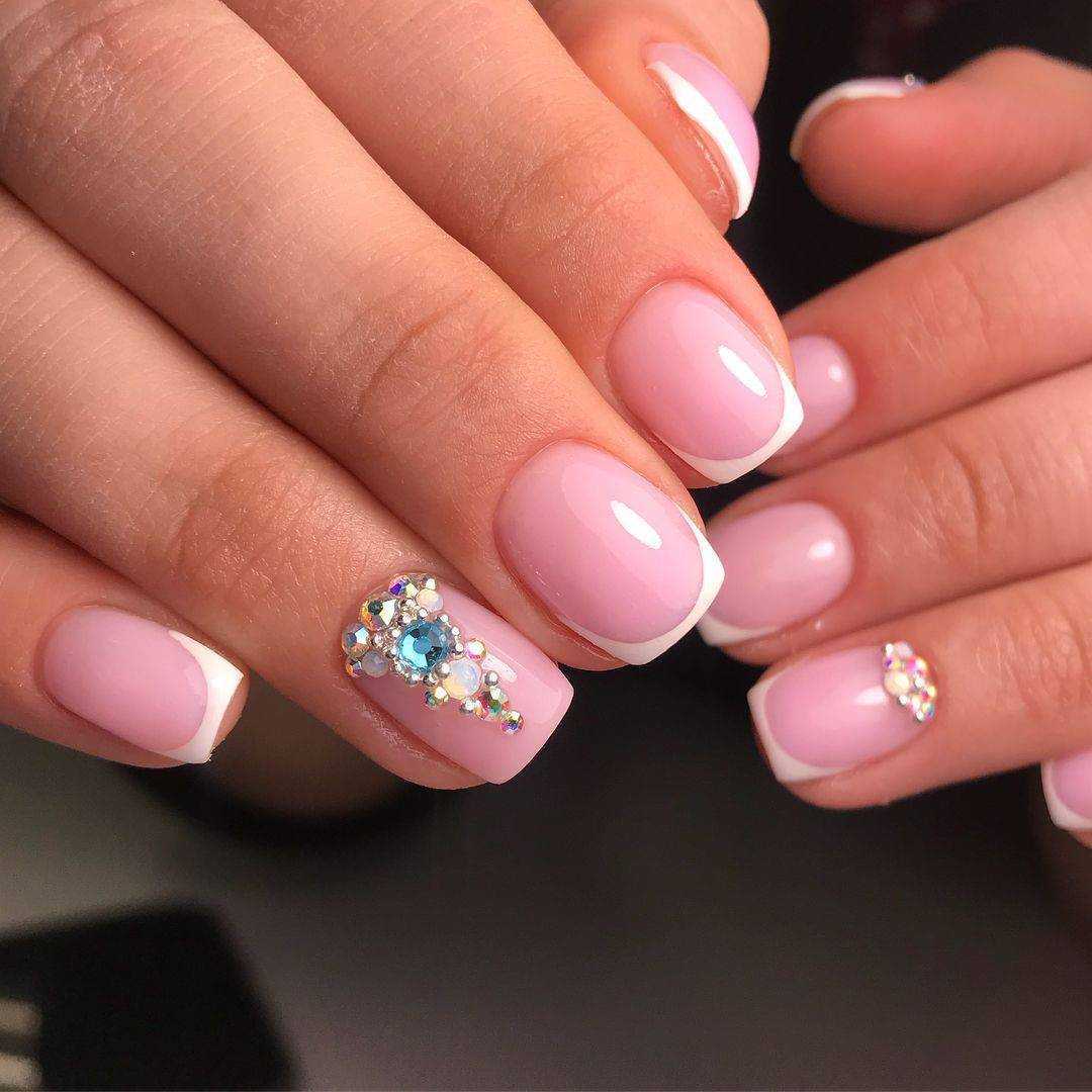 Стилисты рекомендуют особо не экспериментировать с цветовой палитрой и формой «улыбки» при создании френча на коротких ногтях. Остановите свой выбор на классических светлых оттенках, лишь незначительно дополнив их стразами, бульонками, фольгой, втиркой и другим декором.