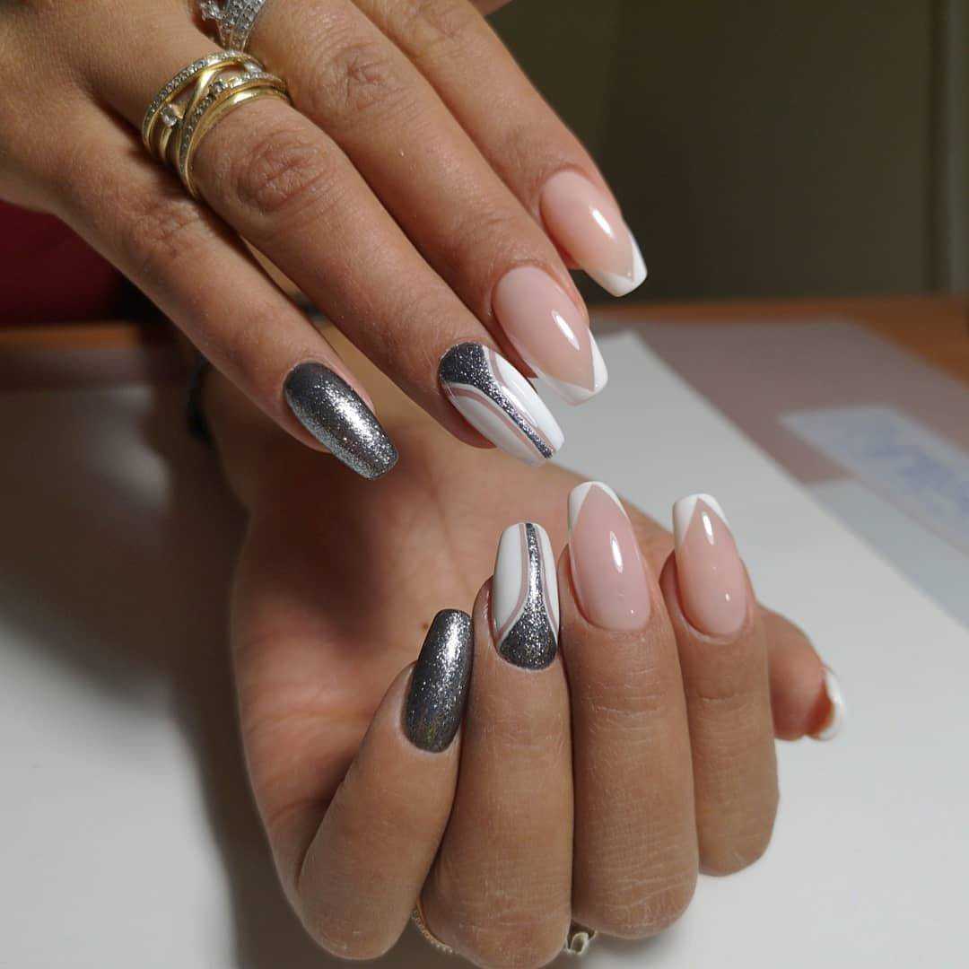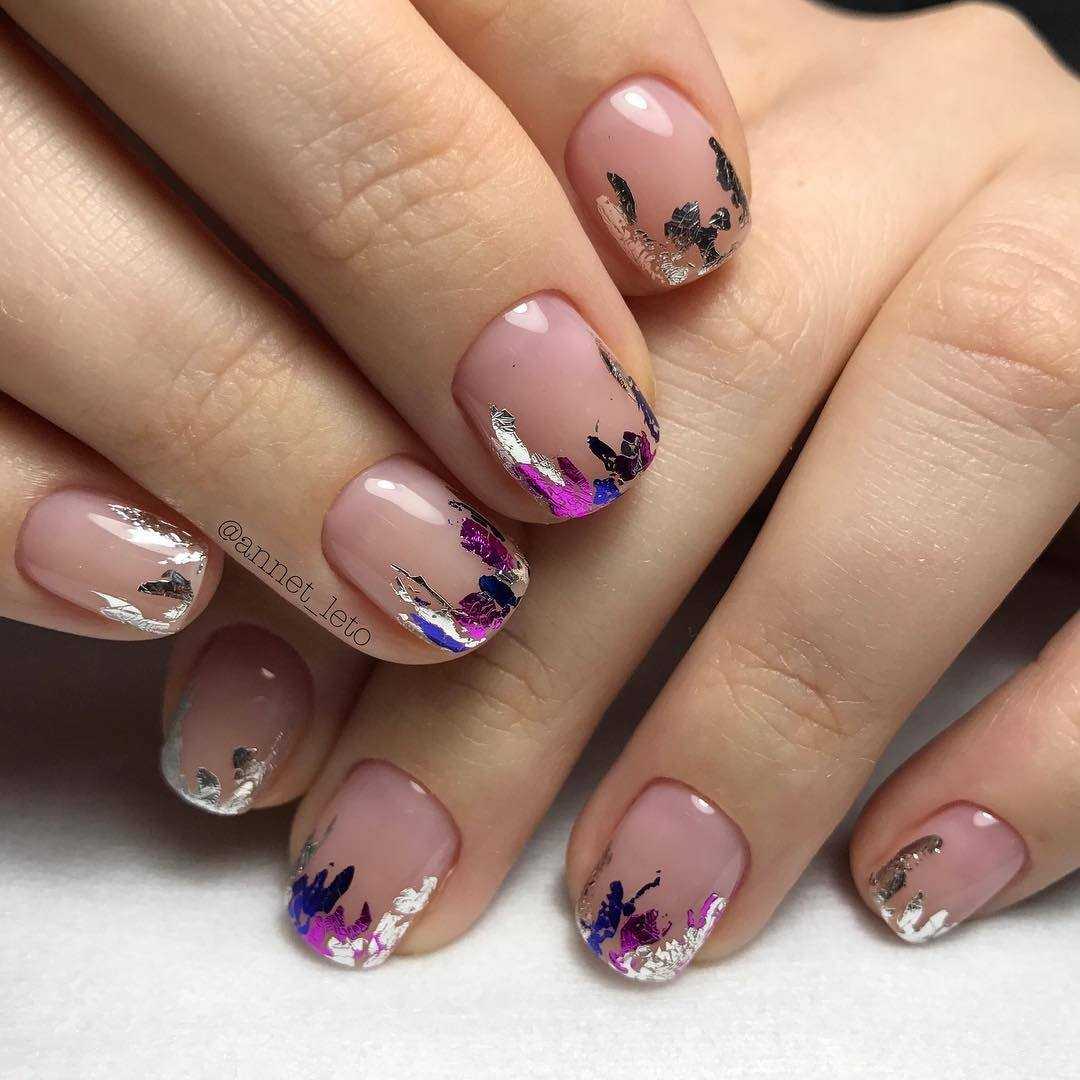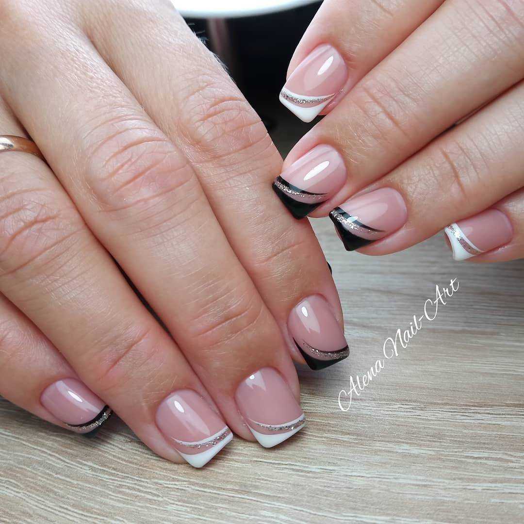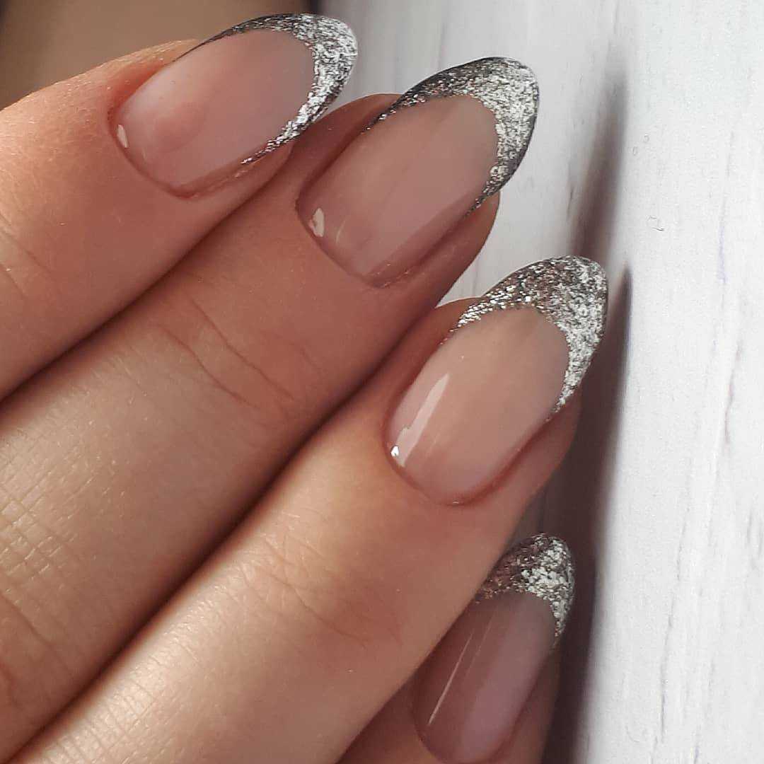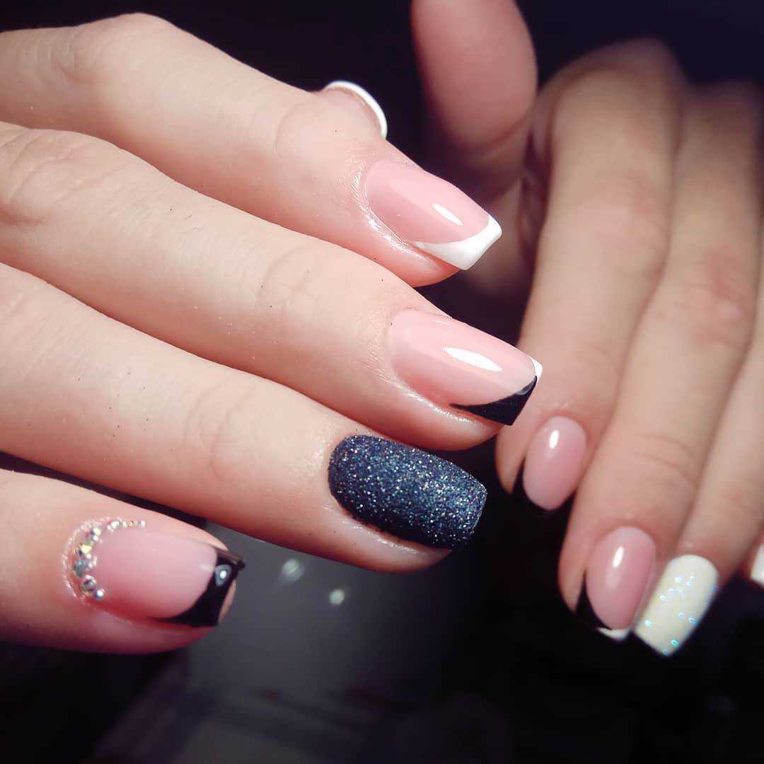 Существует множество интересных идей френча для коротких ногтей. С помощью блестящего дизайна можно добавить немного дополнительного мерцания в жизнь. Френч включает нейтральный фон, темные кончики и блеск, который распределяется неравномерно.
