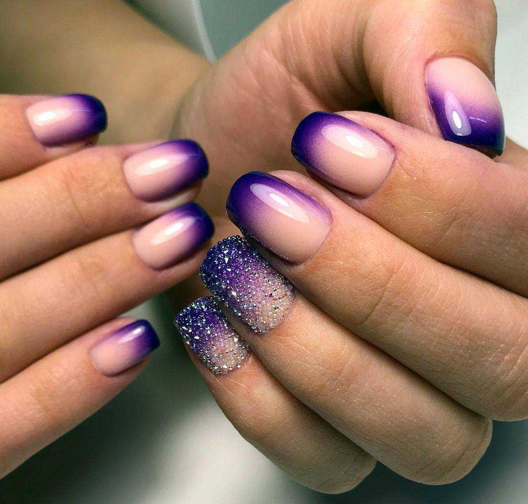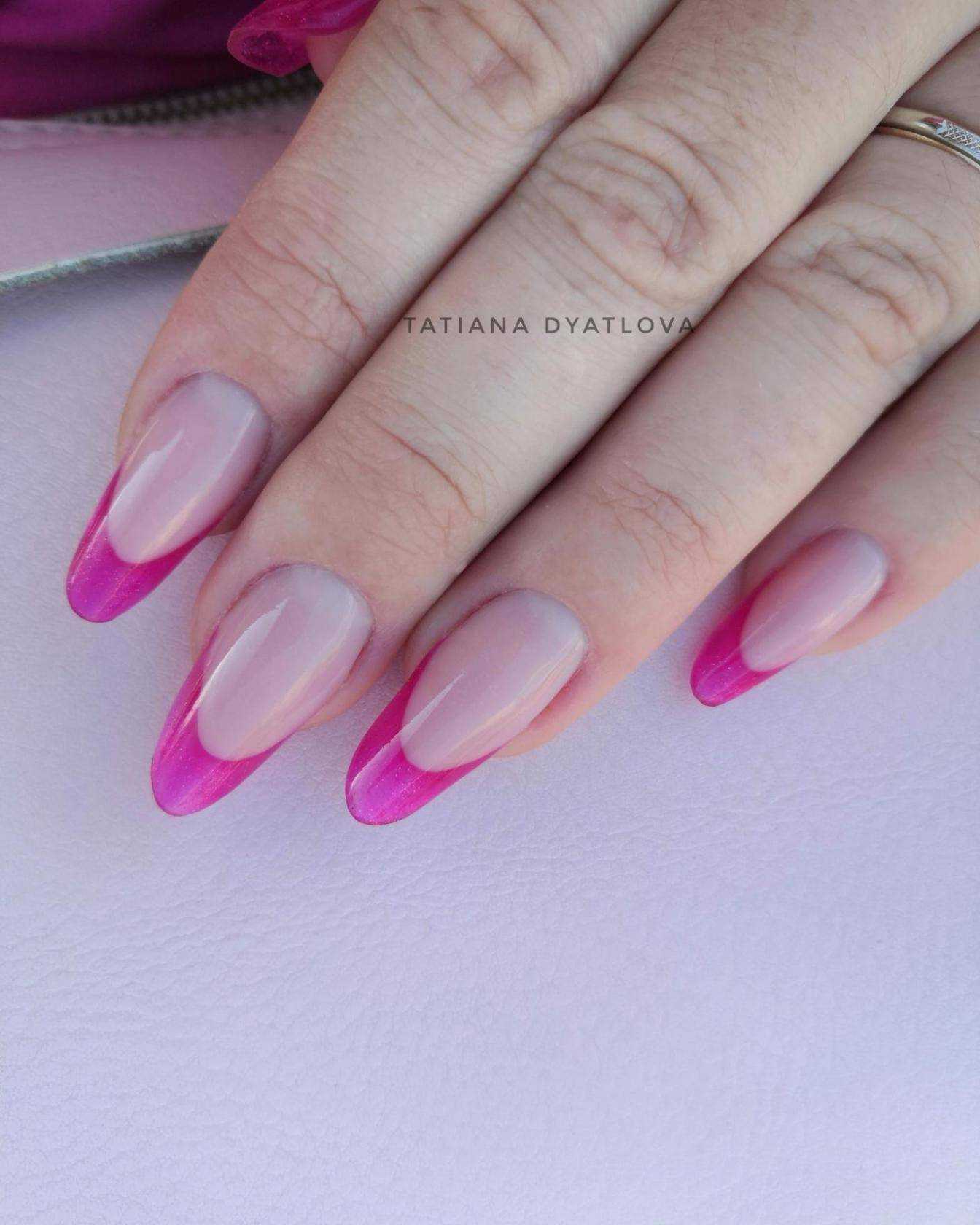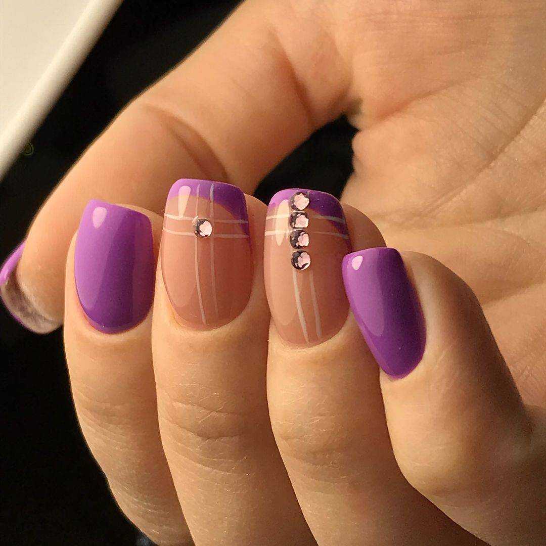 - Французский предполагает белый кончик, который плавно переходит в насыщенный фиолетовый в нижней части. Интересное решение для любых размеров.