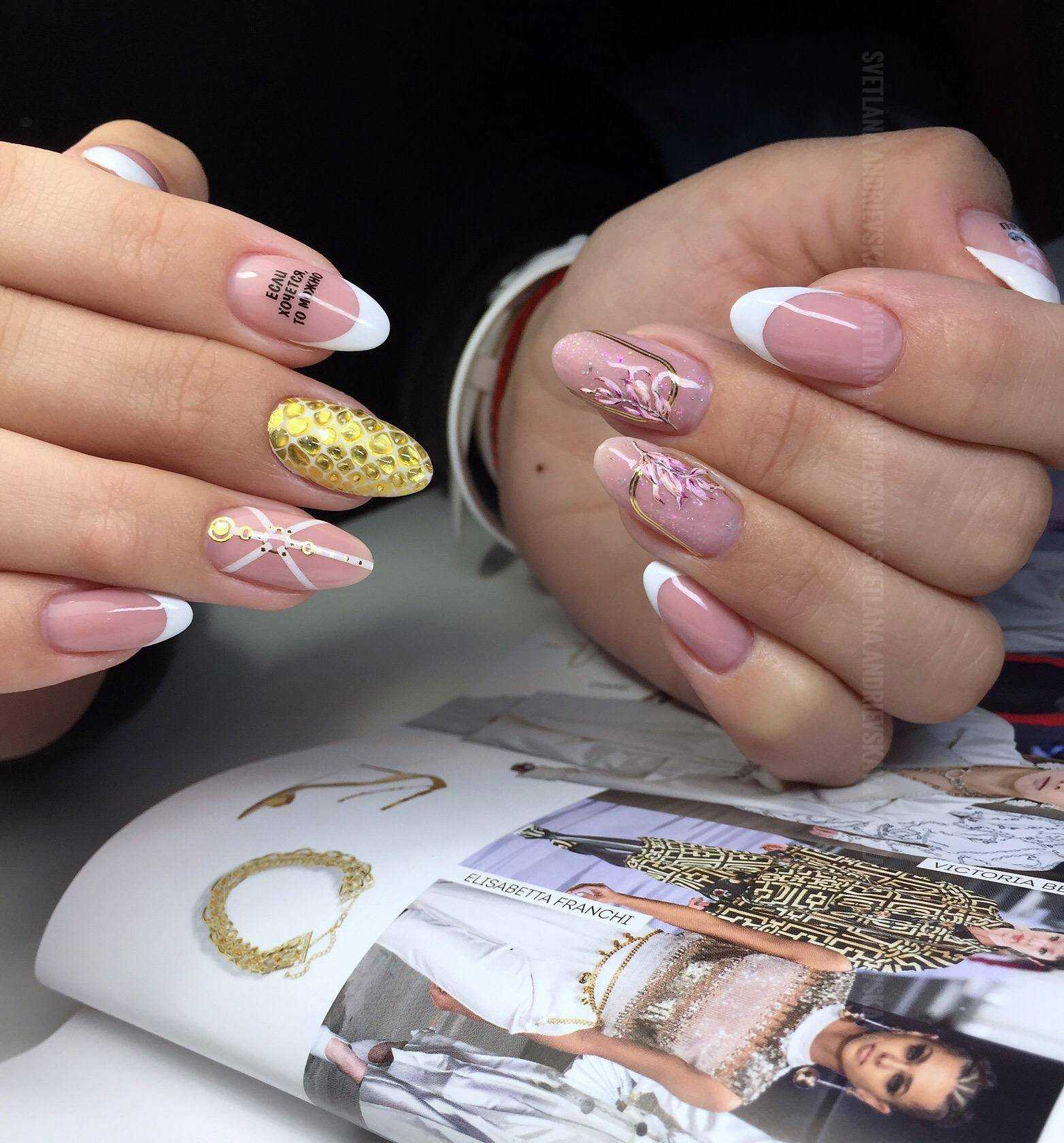 На длинных ногтях будут отлично смотреться маникюр, выполненный в разных техниках с использованием разных декорирующих элементов: