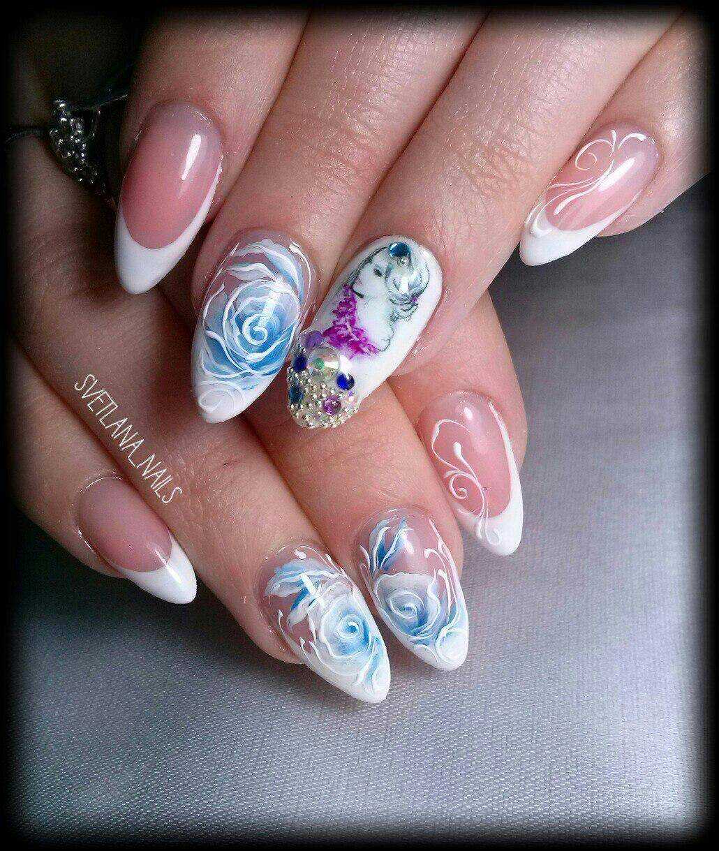 Сделать французский маникюр необычным, можно не только меняя направленность линии улыбки. Смело дополняйте дизайн рисунком, который отразит ваше виденье прекрасного.