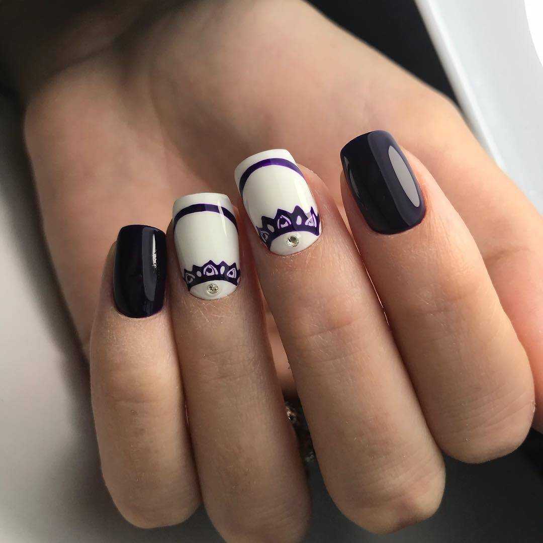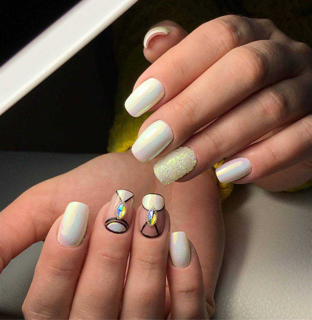 Сейчас также в тренде геометрический маникюр, поэтому смело добавьте к покрытию цветных полосок. И не забывайте о рисунках. Уместными в вечернем дизайне ногтей будут цветочные композиции, вензеля и кружева. Красоту можно дополнить стразами или блестками.