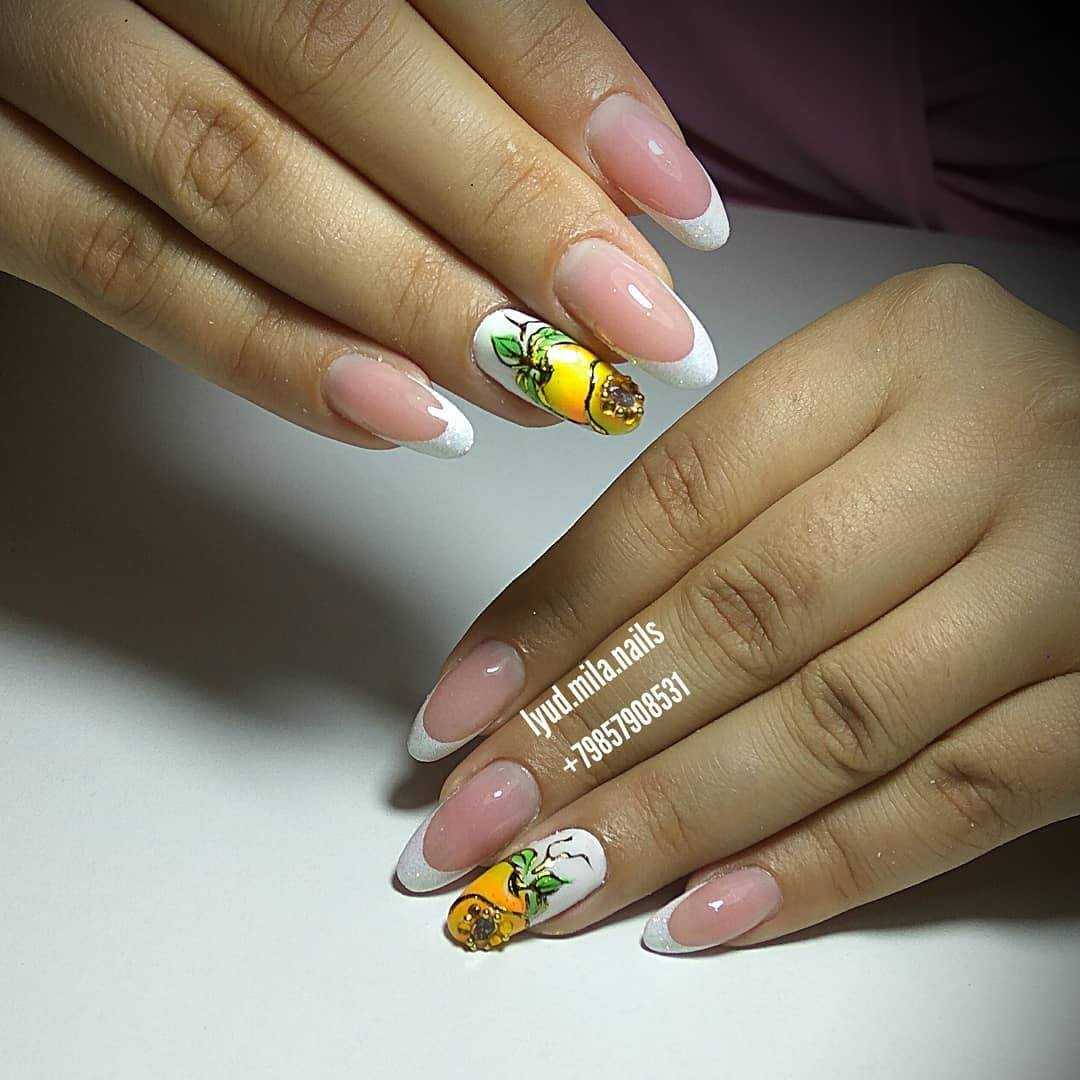 Пожалуй, один из самых модных видом дизайна на лето – френч с фруктово-ягодным рисунком. Это прекрасный вариант для жарких будней, поездок и отпуска. Чаще всего его делают на ноготках средней длины, что позволяет реализовать любую задумку.