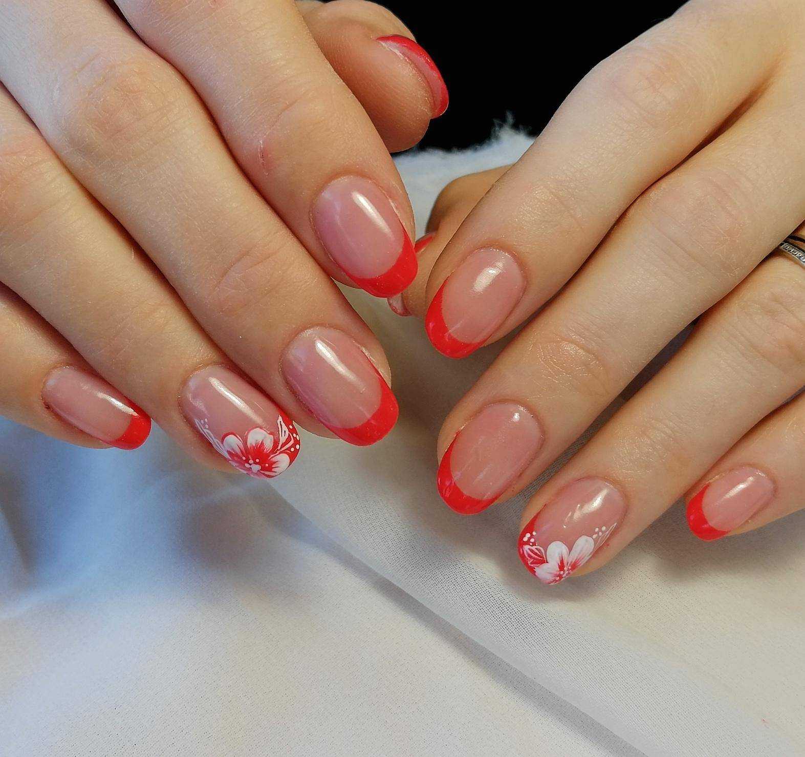 Крупные, яркие цветы – то, что нужно в весенне-летнем сезоне. Причем они могут быть в тон основному покрытию или же выступать в качестве акцента в маникюре. В любом случае французский маникюр с цветами придает образу особую элегантность.