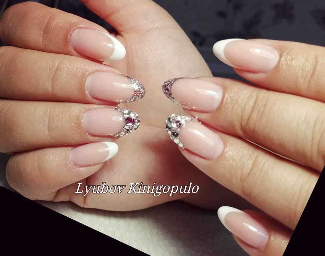 Такой маникюр очень похож на классический френч. Разница заключается в том, что вместо белого лака используют блестки. Такой маникюр гель-лаком можно сделать на какое-то особое событие. Он больше похож на вечерний (например, новогодний маникюр), нежели на повседневный. Блестки допустимо использовать разных размеров, крупные, мелкие или смешанные, главное хорошо зафиксировать их прозрачным лаком. Французский маникюр с блестками выглядит очень эффектно и респектабельно, отличный вариант зимнего маникюра. Чтобы сделать более нежный маникюр можно дополнительно можно декорировать ноготки стразами небольшого размера или жемчугом.