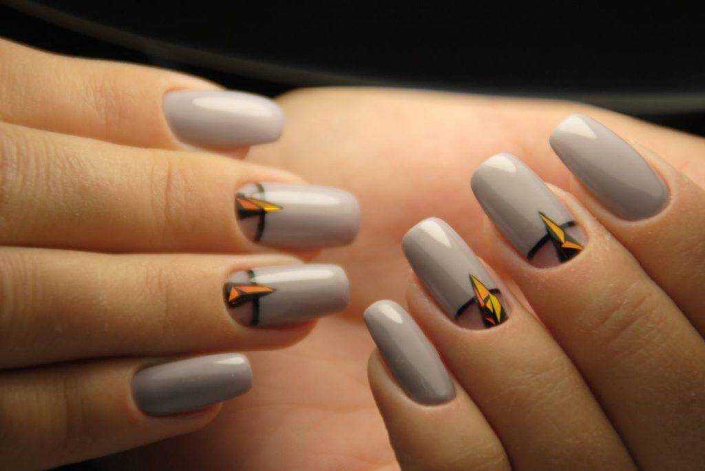 Самым популярным дизайном маникюра в осенний и зимний период считается твид. Он имеет общее сходство с вязаным маникюром. Оба они великолепно сочетаются с серыми оттенками лакового покрытия. Для выполнения твидового маникюра берутся черные, серые и белые лаки. Сам узор не имеет сложностей. В его основу входят простые линии различных размеров, которые наносят на кончик ноготка.
