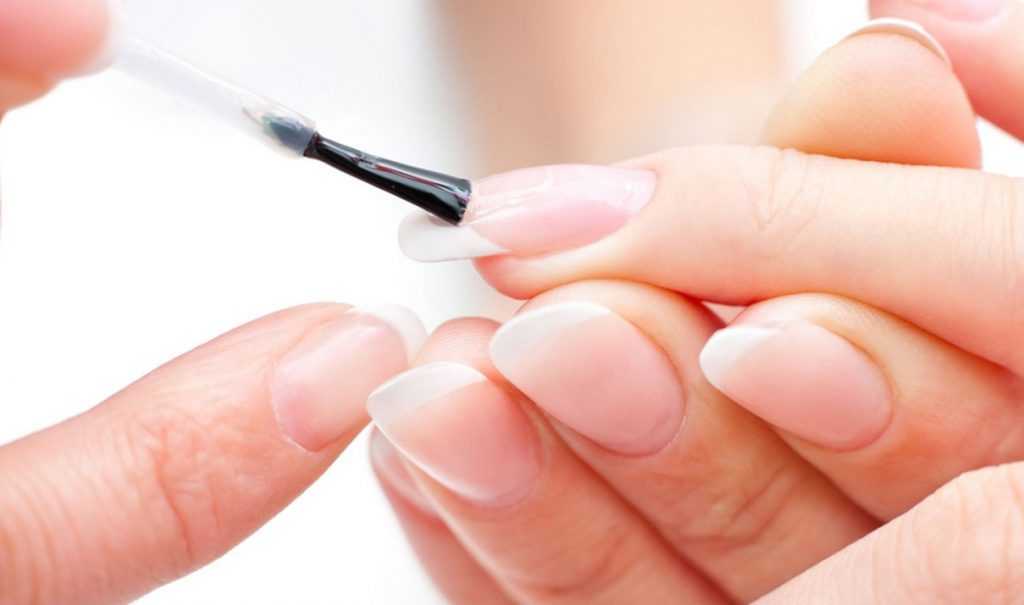 На ногтевые пластины наносят слой праймера, а затем – прозрачный или нежный розовый, телесный лак. Дают ему хорошо высохнуть.