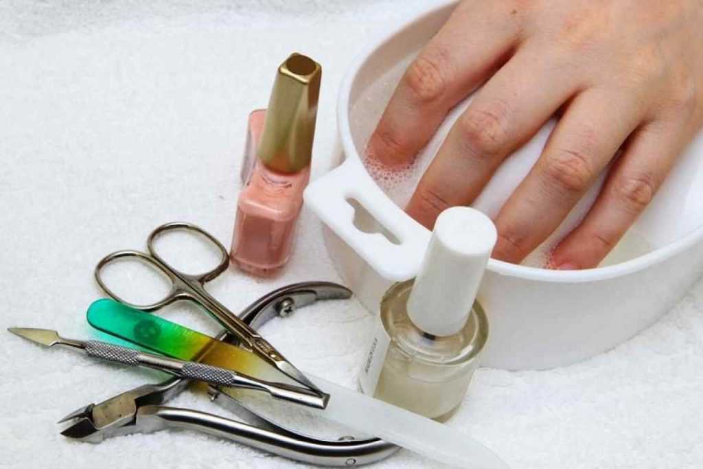 Ноготки подпиливают, придавая им нужную длину и форму, полируют. После помещают руки в ванночку с тёплой водой на 5 минут.