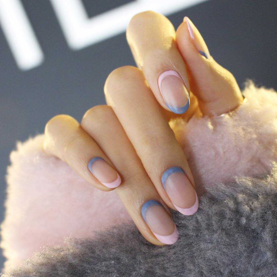 Двойной французский маникюр может быть не только одинарным, но и двойным (и даже больше). Сделать его просто — достаточно разделить зону улыбки на две части и оформит их последовательно в разные цвета.