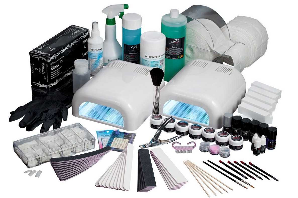 - Для работы вам понадобится стартовый комплект. В его состав входит ультрафиолетовая лампа (самая простая имеет время воздействия до 2 минут, но этого достаточно для серьезного дизайна ногтей), база, закрепитель, цветные лаки. Также может понадобиться приобрести обезжириватель;
