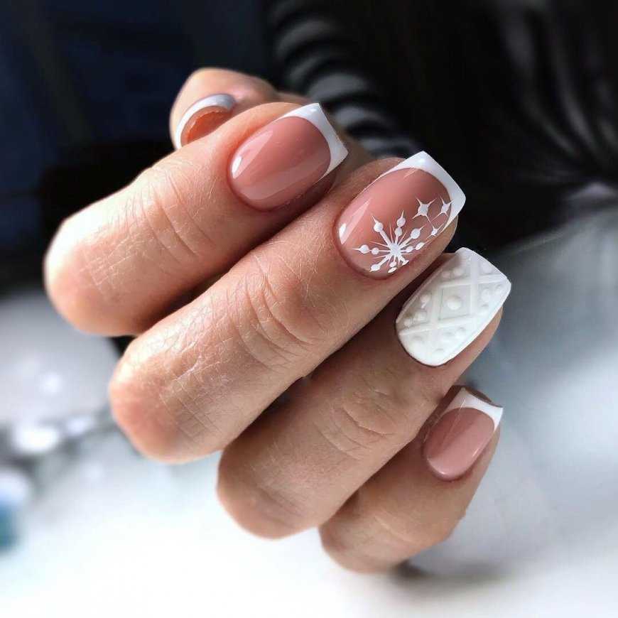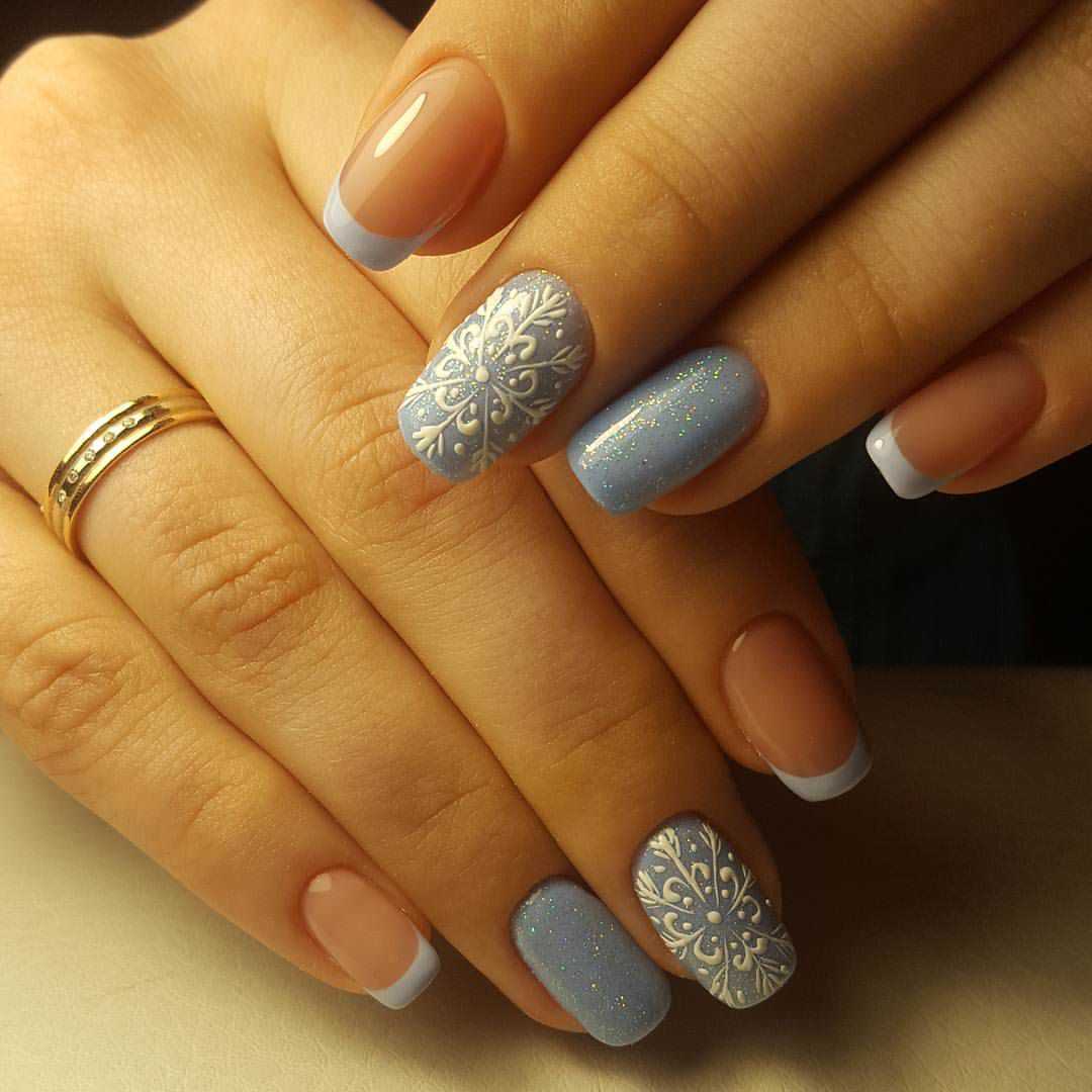 Учитывая, что отличительная черта французского маникюра – нежность, рисунки тоже должны быть воздушными, утонченными. Для этой роли как нельзя лучше подходят снежинки различной конфигурации, абстрактные завитки, имитирующие морозные узоры на окнах. Их стоит выполнить белым лаком на прозрачном фоне, можно также воспользоваться микроблестками, сделать элементы объемными. Кстати, не обязательно выделять таким способом акцентные ноготки – можно использовать миниатюрные изображения для оформления свободного края.