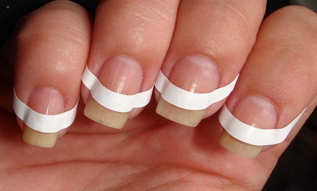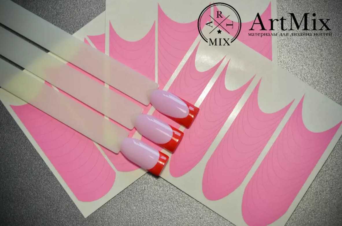 Об этом методе мы уже говорили. Главное, ровно и аккуратно закрепить трафарет, затем таким же образом удалить его. Также учтите предполагаемую ширину линии «улыбки» (если ногти короткие, они должны быть тоньше длинных) и по ней приклейте трафарет.