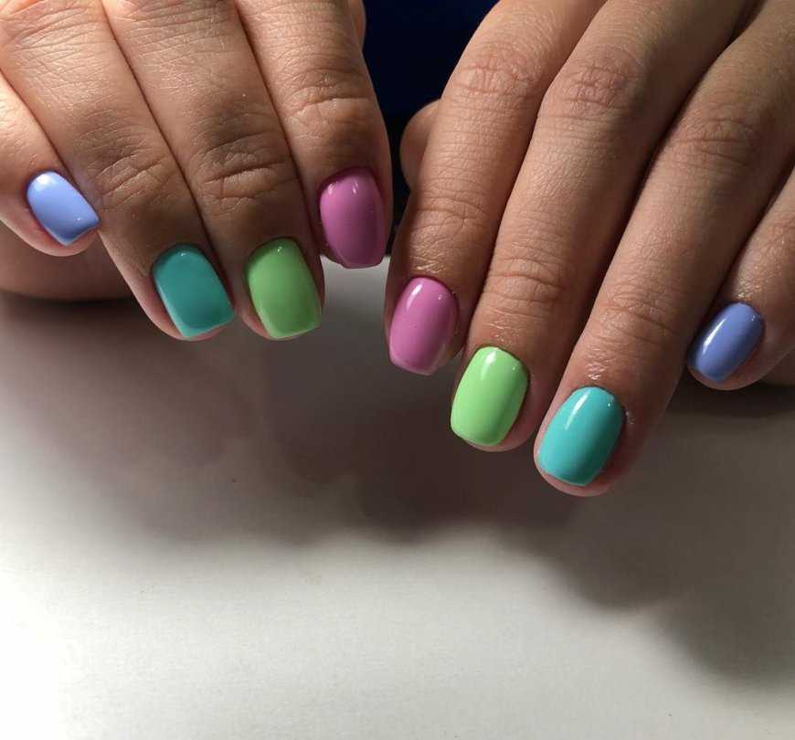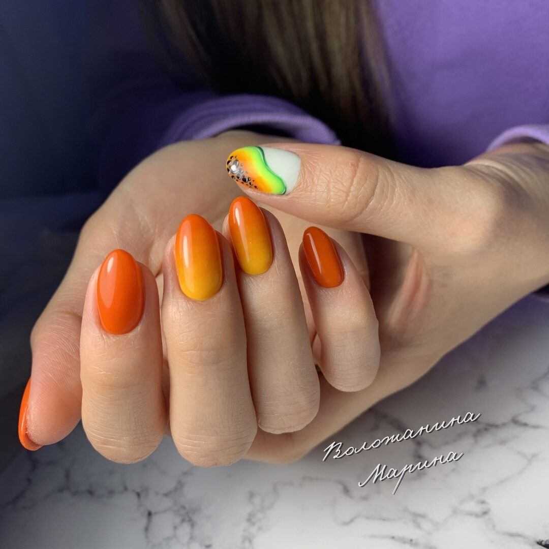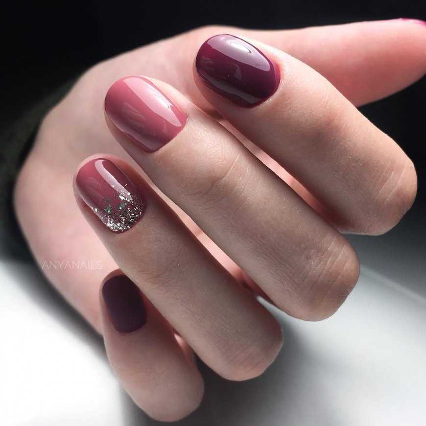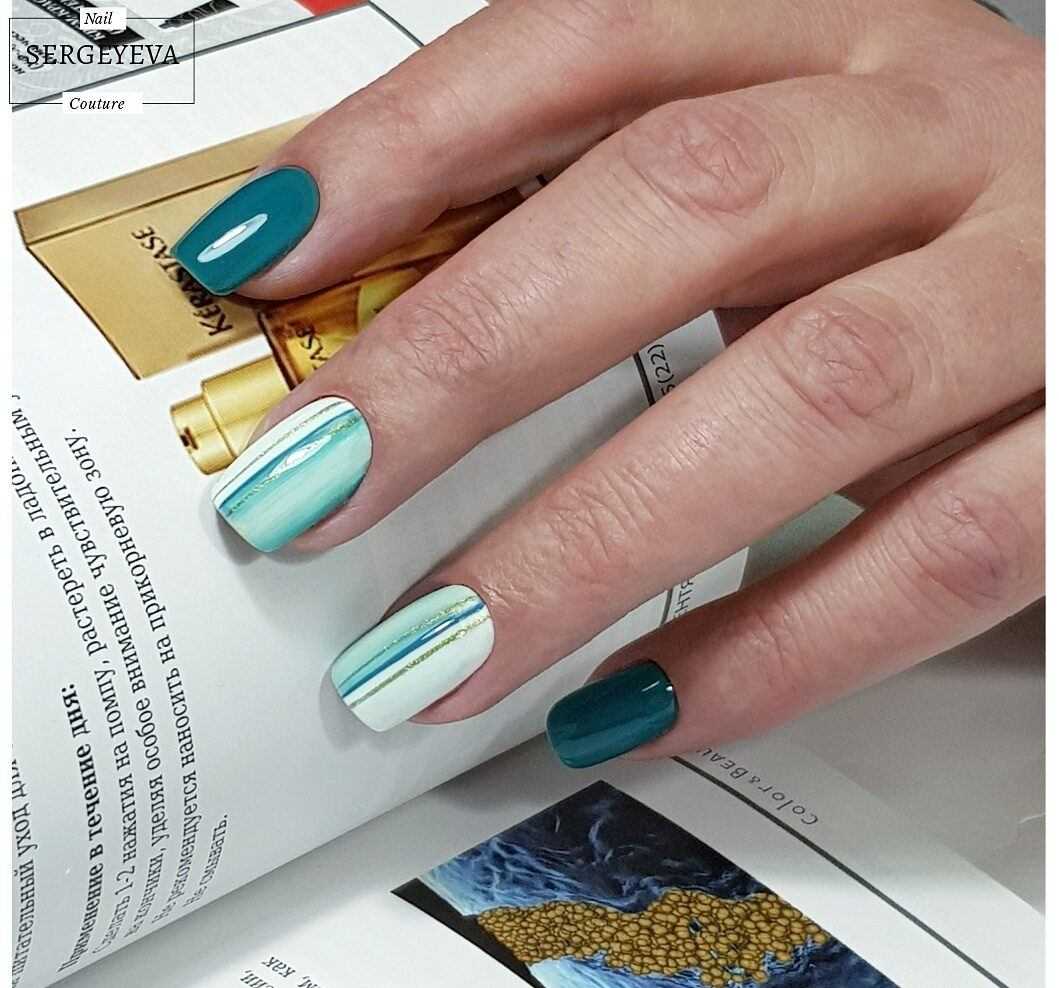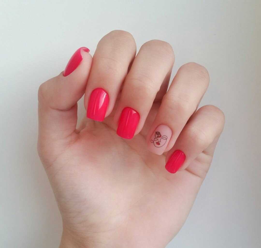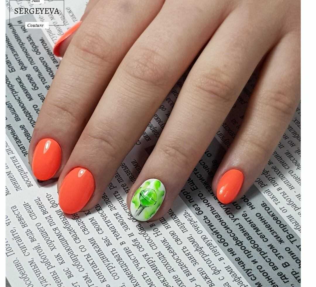 Возможно выполнение одноцветного лаконичного дизайна либо использование какого-либо дополнения для двух пальцев. В летнее время на таких ногтях неплохо выглядят любые рисунки «отпускной» тематики, абстрактные узоры, стемпинг.