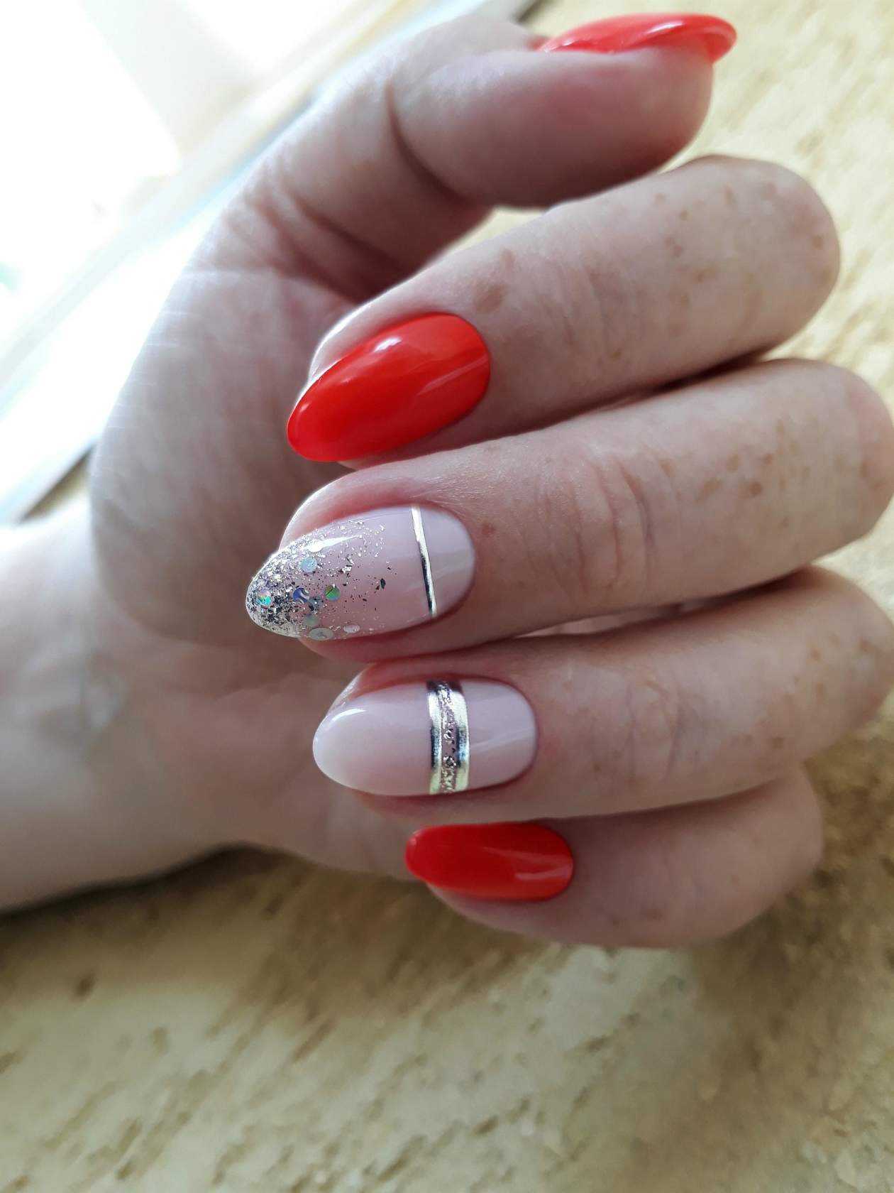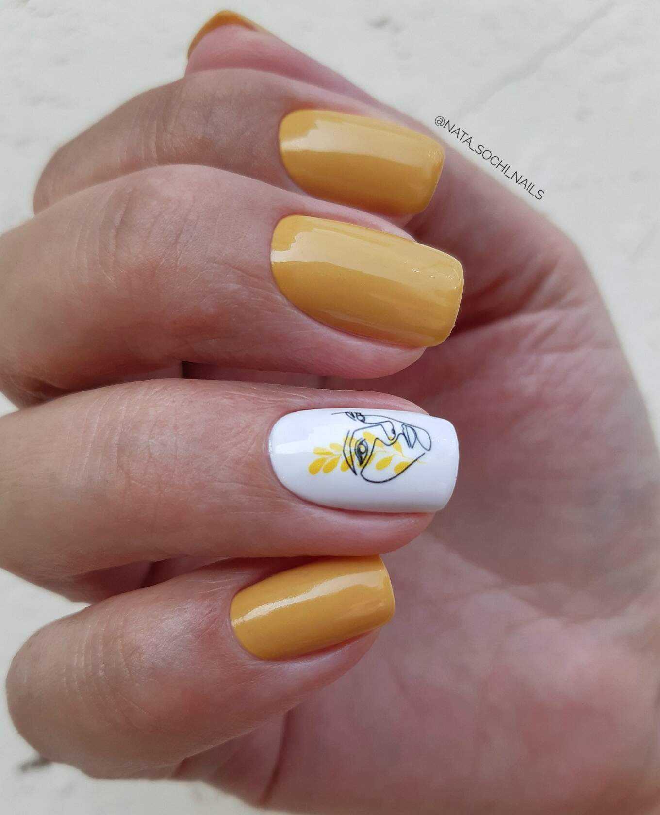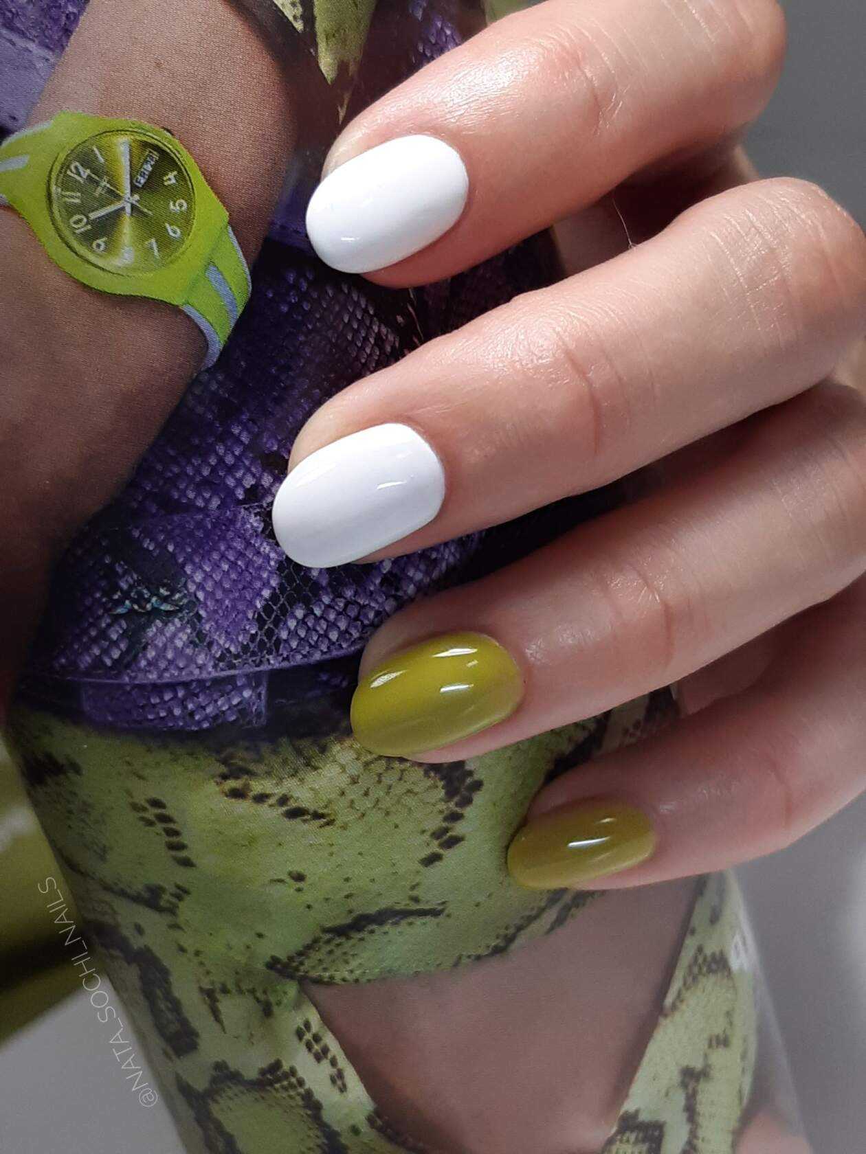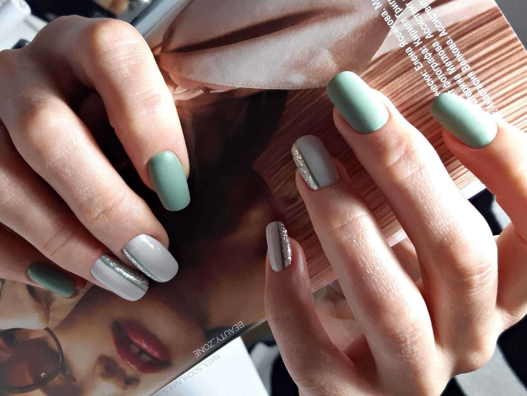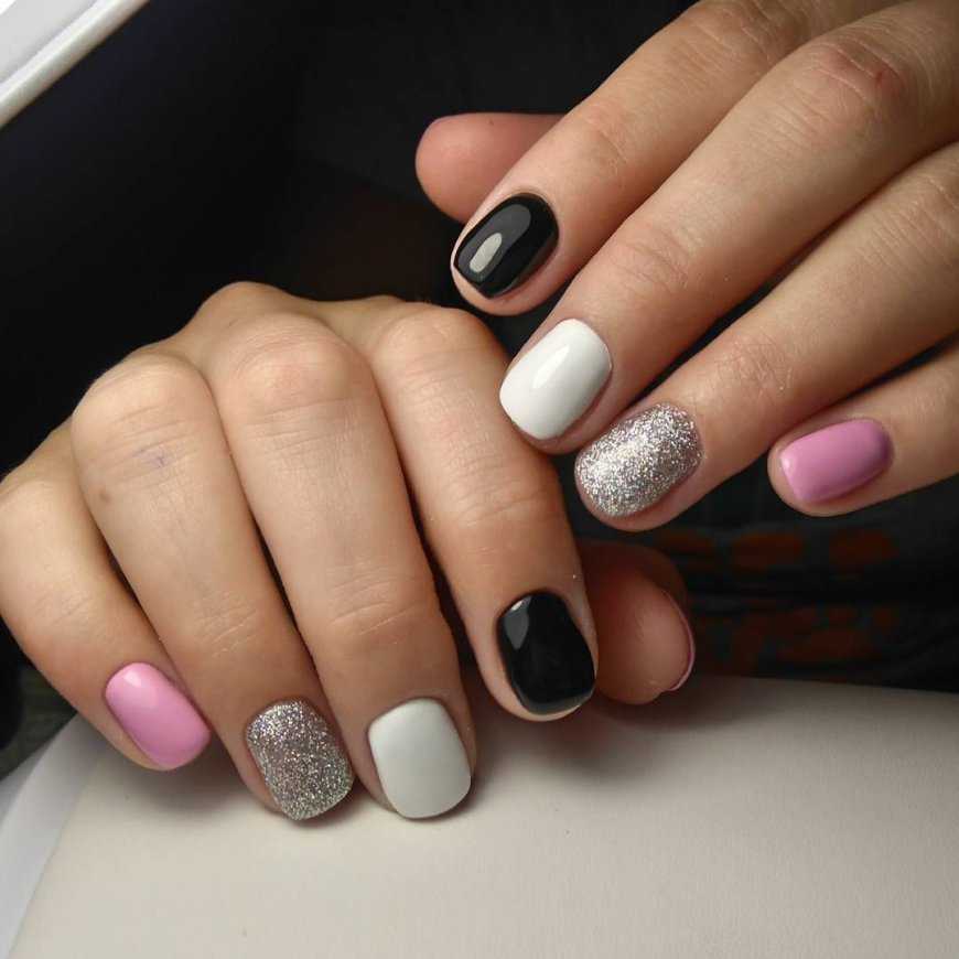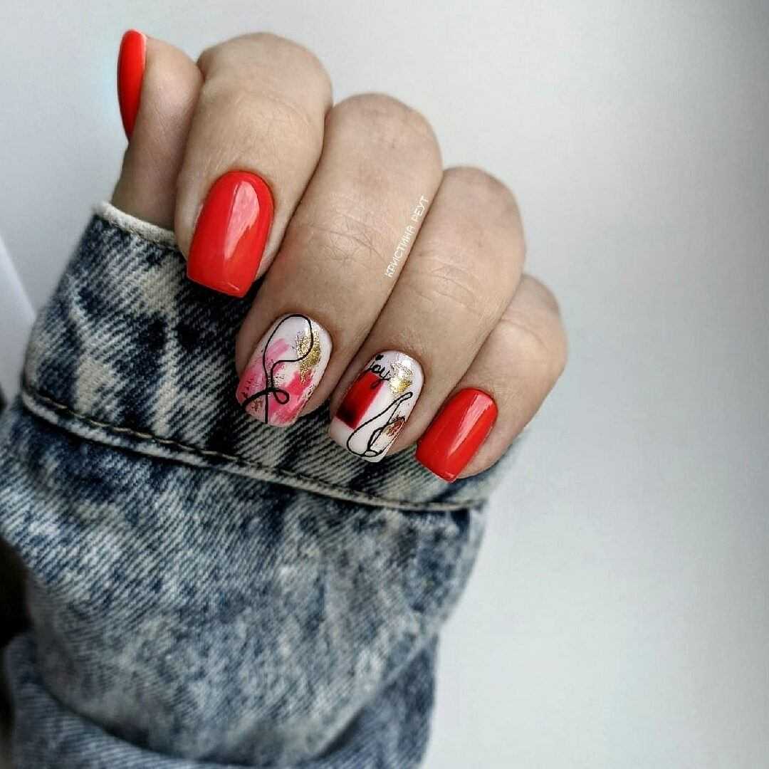 Возможно выполнение одноцветного лаконичного дизайна либо использование какого-либо дополнения для двух пальцев. В летнее время на таких ногтях неплохо выглядят любые рисунки «отпускной» тематики, абстрактные узоры, стемпинг.