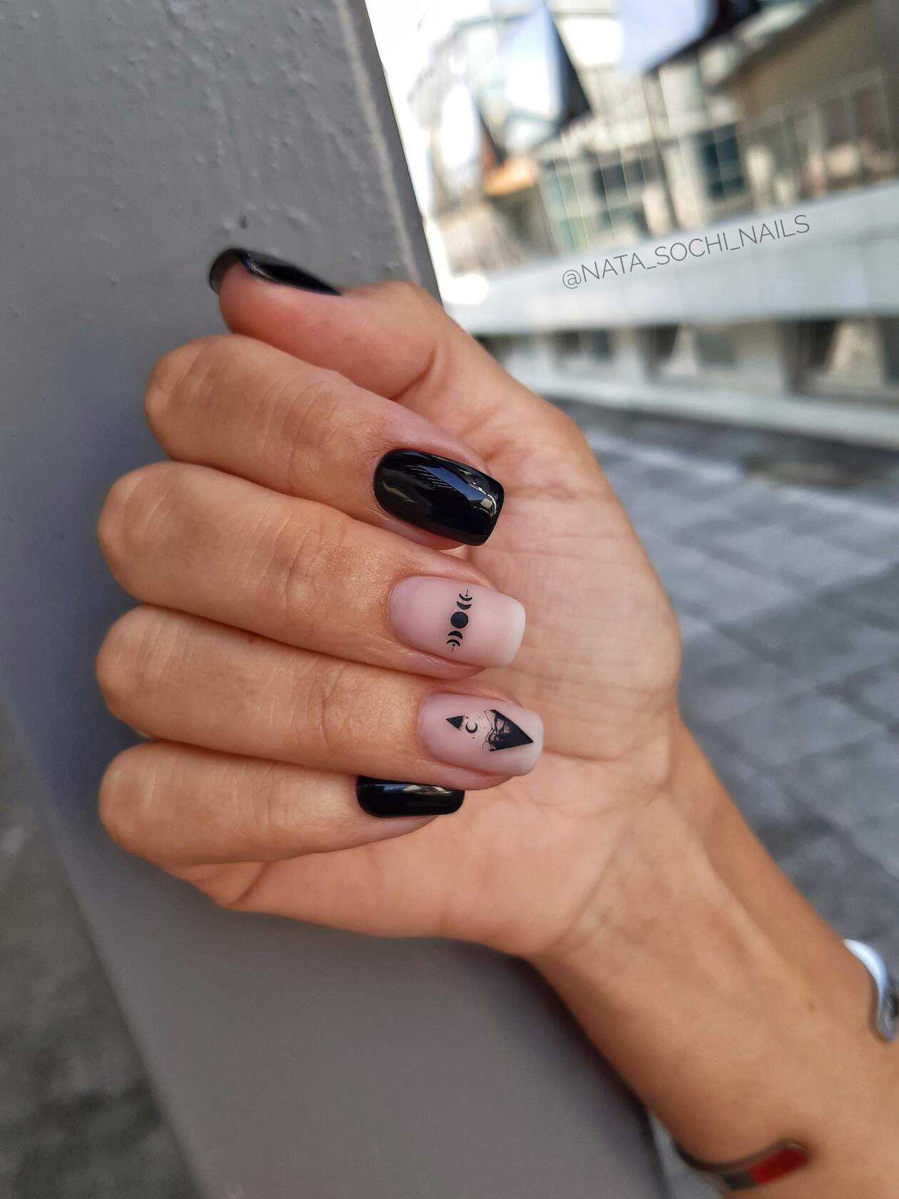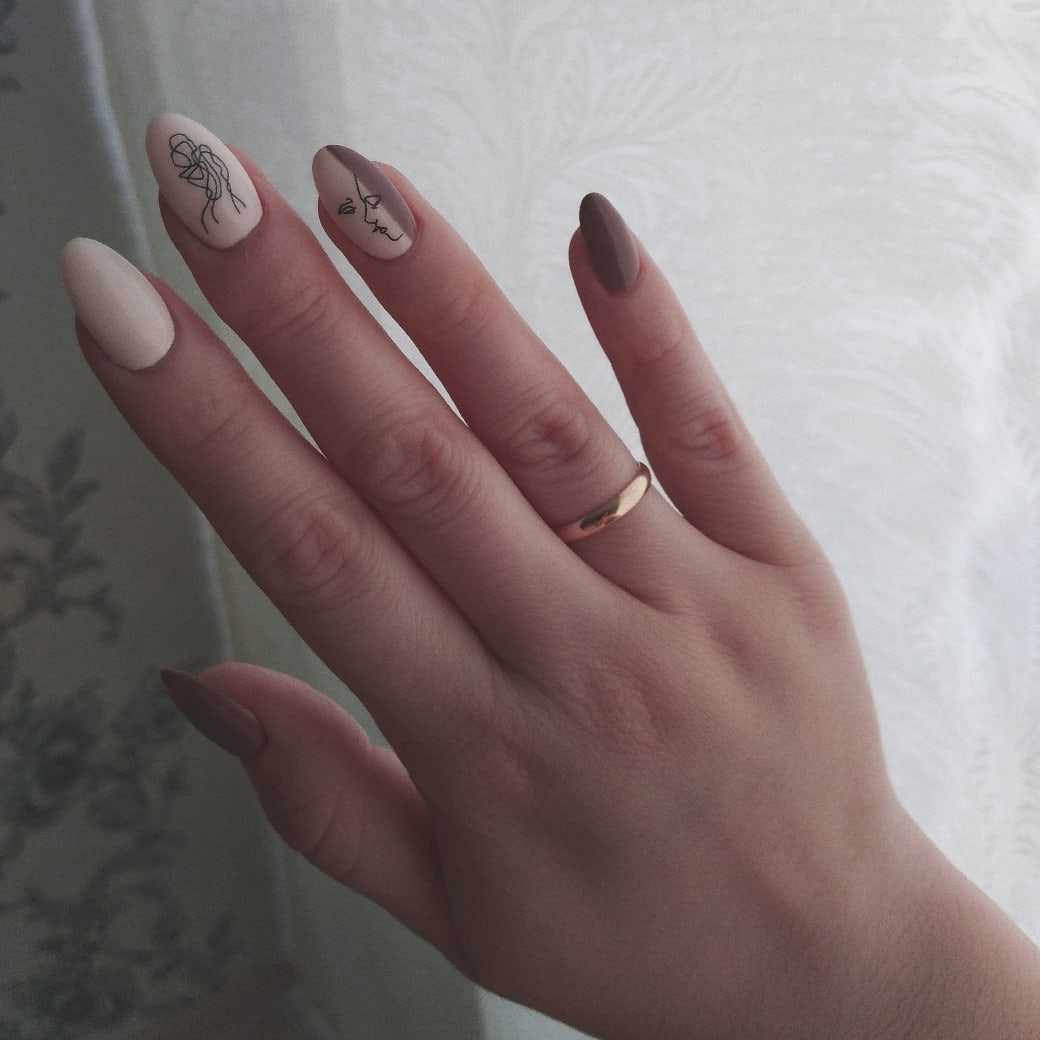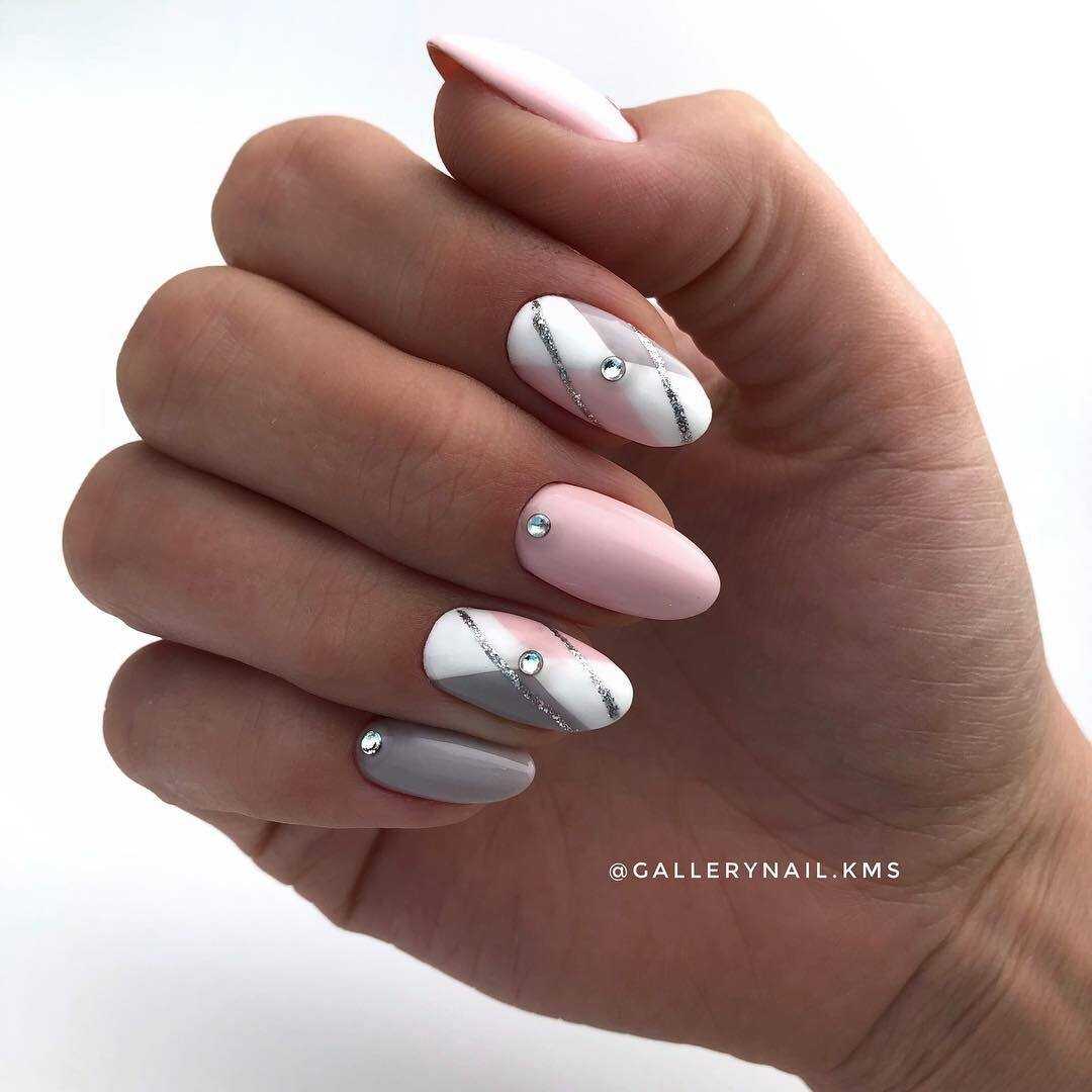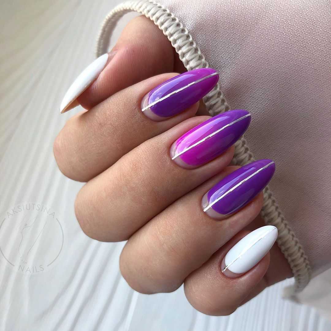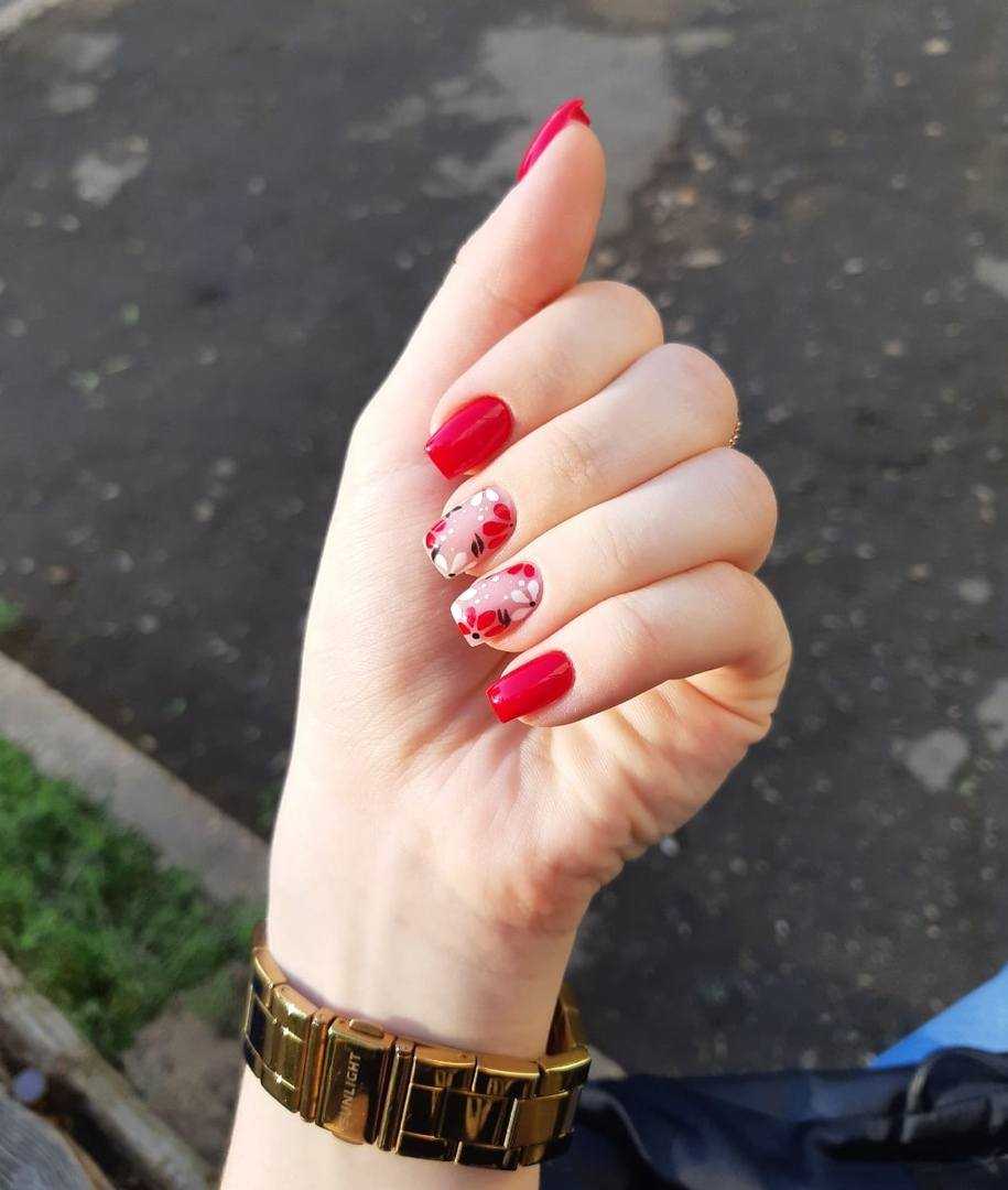 Возможно выполнение одноцветного лаконичного дизайна либо использование какого-либо дополнения для двух пальцев. В летнее время на таких ногтях неплохо выглядят любые рисунки «отпускной» тематики, абстрактные узоры, стемпинг.