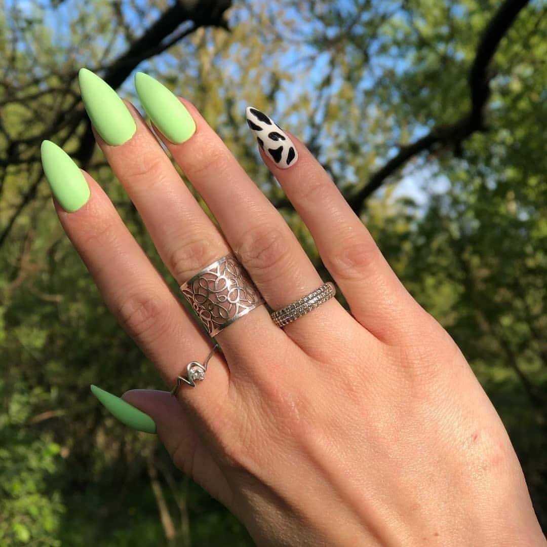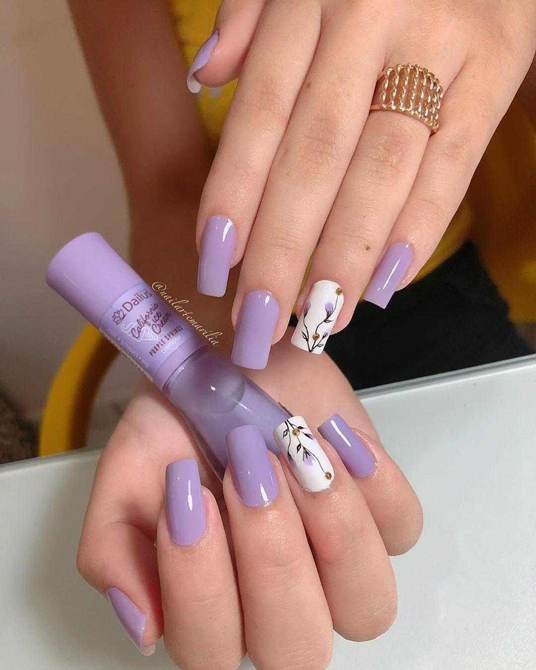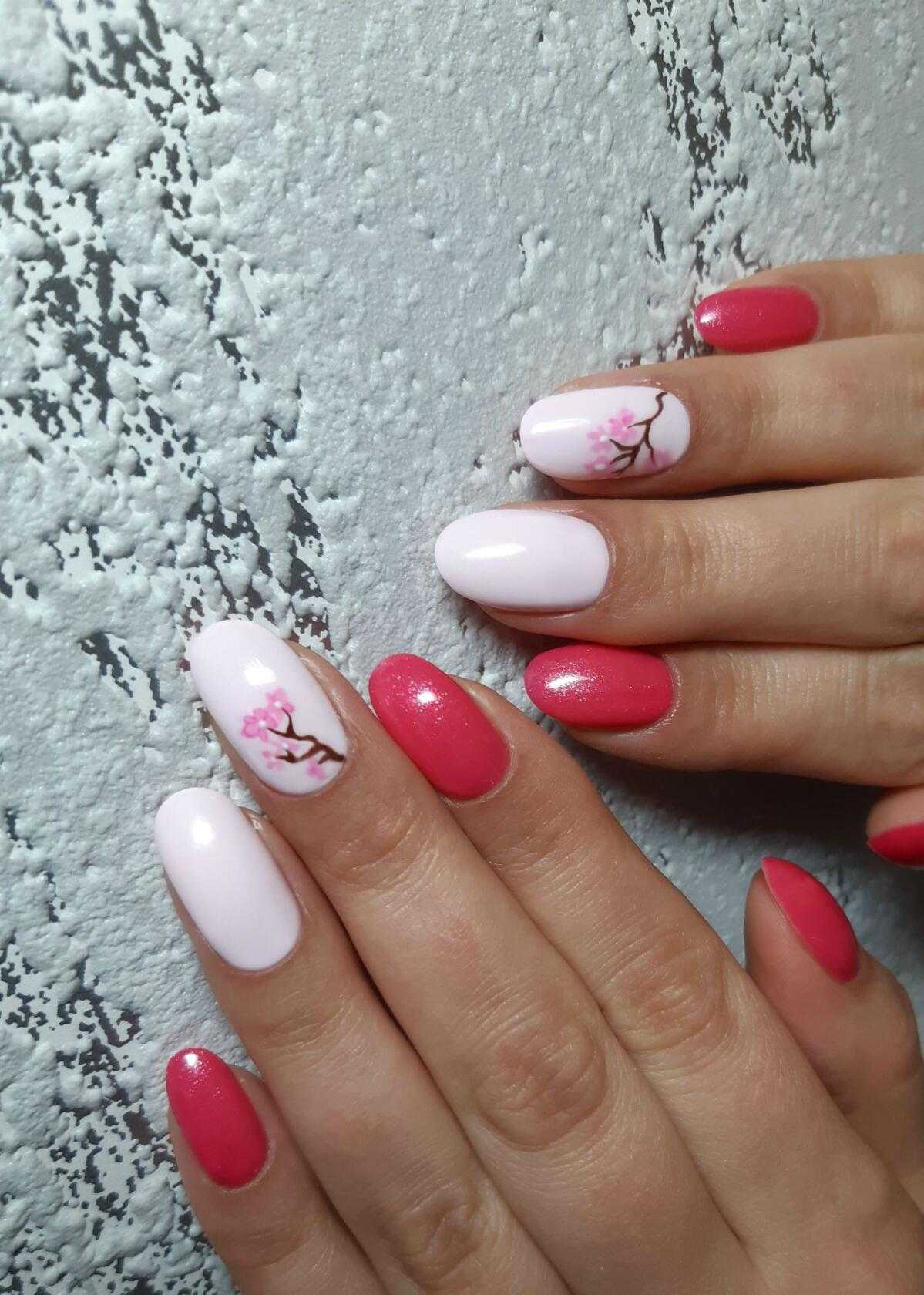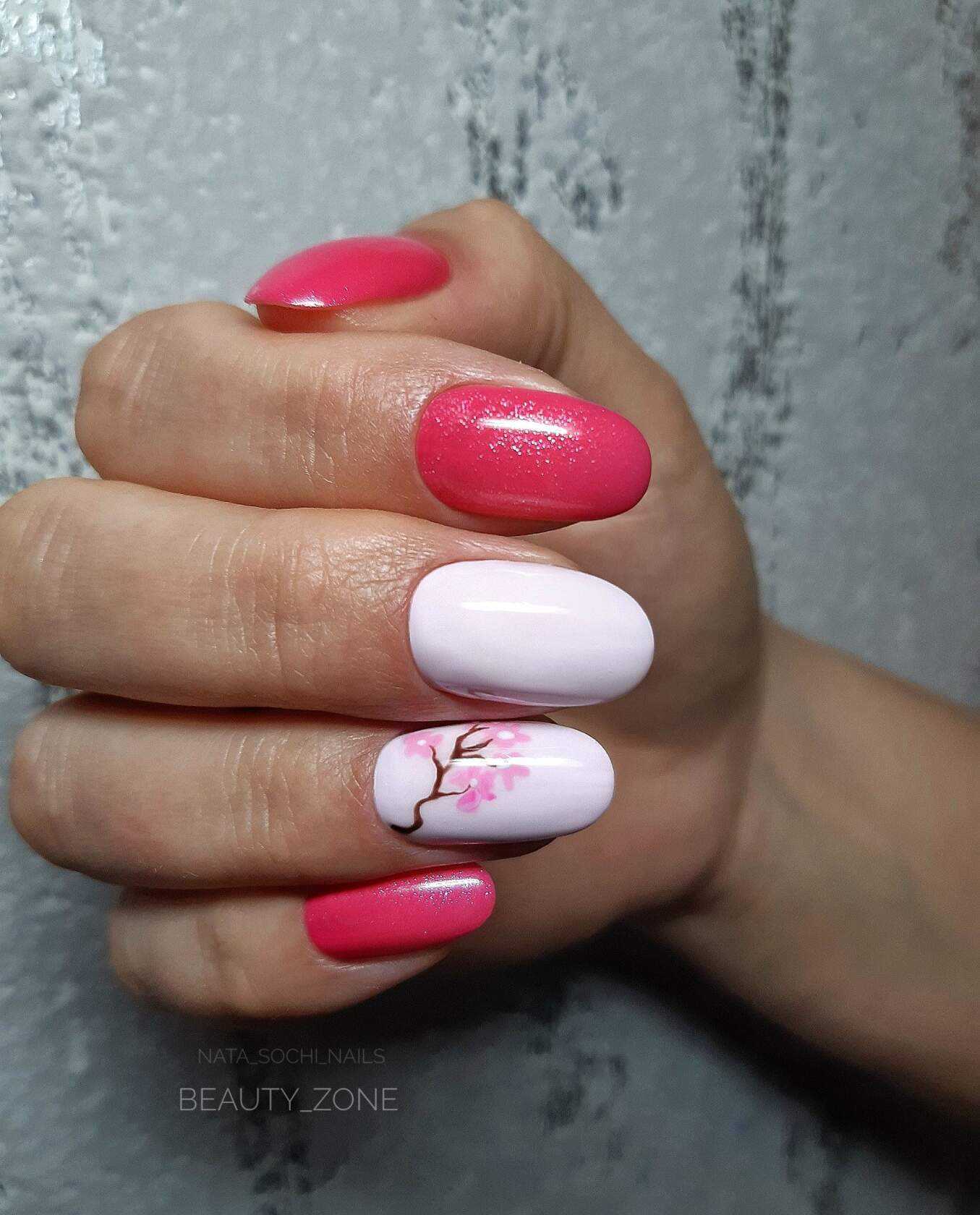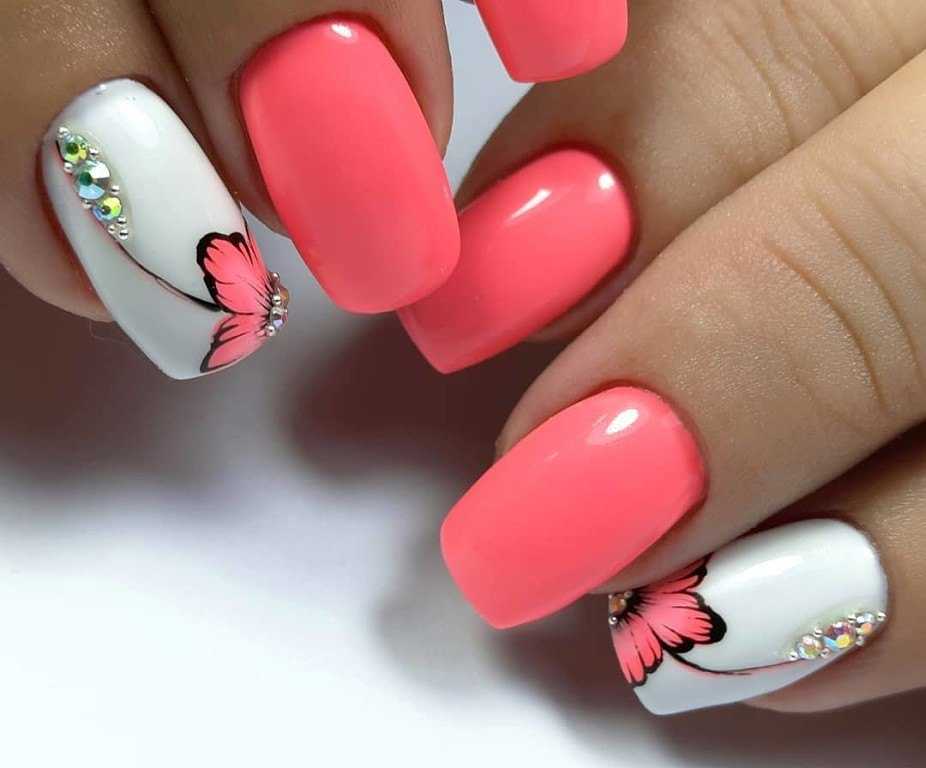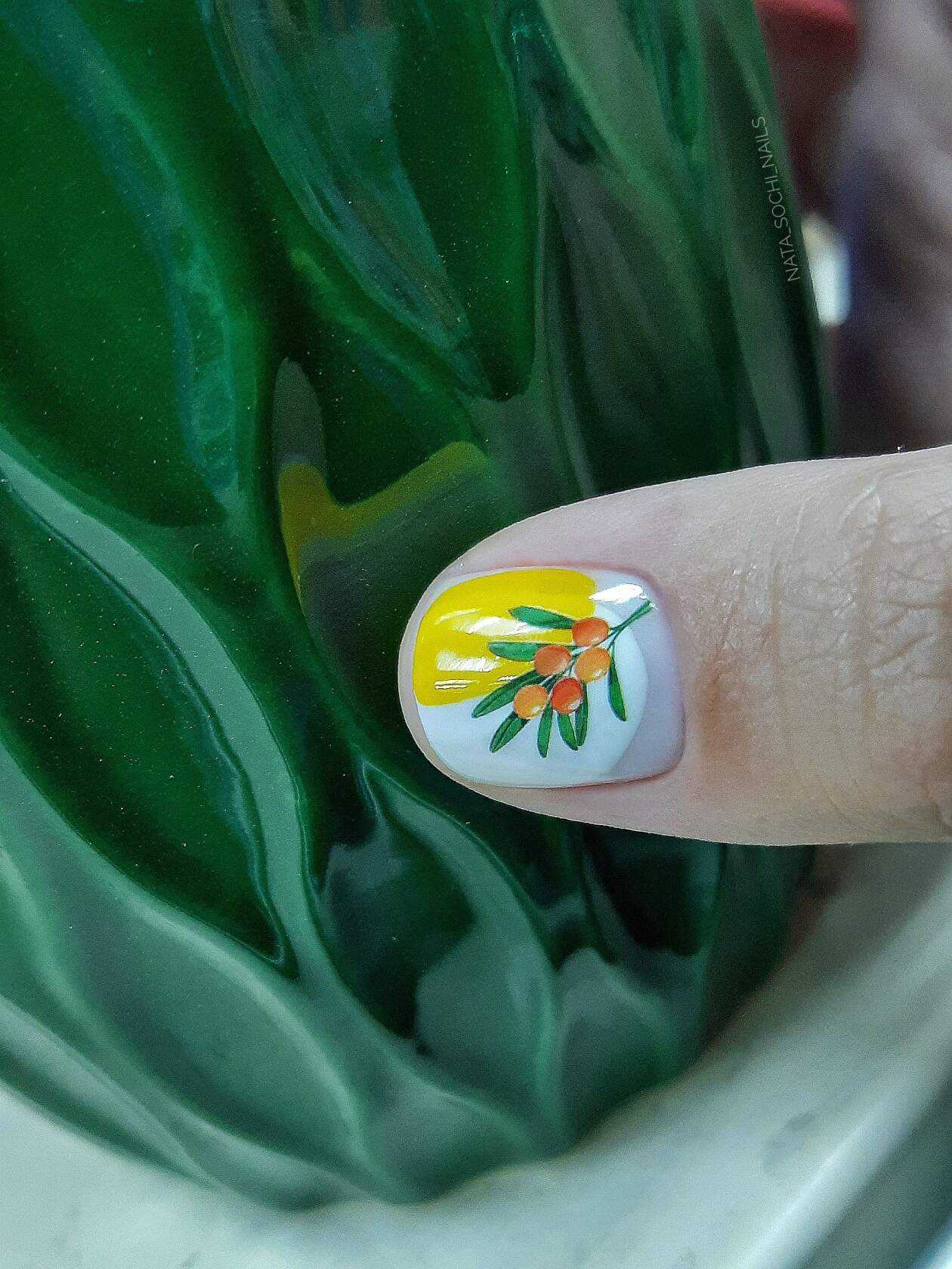 Возможно выполнение одноцветного лаконичного дизайна либо использование какого-либо дополнения для двух пальцев. В летнее время на таких ногтях неплохо выглядят любые рисунки «отпускной» тематики, абстрактные узоры, стемпинг.