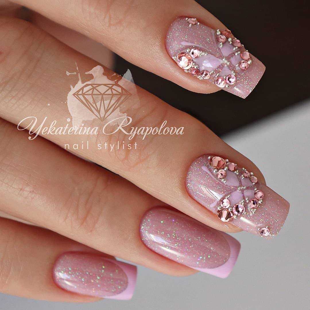 Украшения из стразов добавляют ручкам элегантности и роскоши. Обычно нежный маникюр с камнями выбирают для образа невесты или дополняют вечерний гардероб.