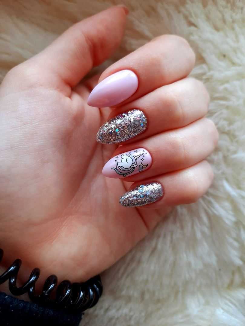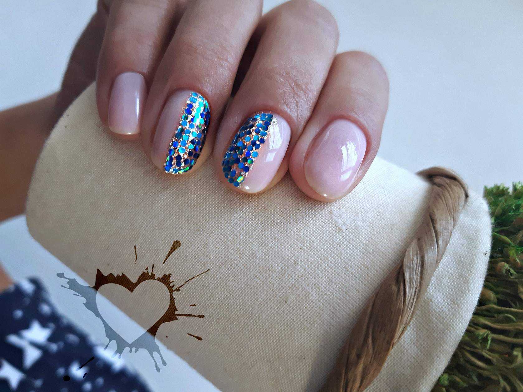 Глиттер и шиммер на полупрозрачной основе не утяжеляет дизайн, поэтому такие украшения идеально подходят даже для коротких ноготков.