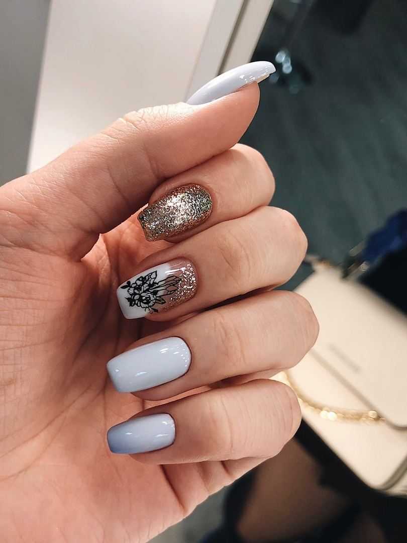 Преимущественно повседневный дизайн подразумевает покрытие каждого ногтя лаком голубого цвета и выделение акцентных пальцев золотыми либо серебряными блёстками, оптимально сочетающимися со слегка холодным тоном. Праздничный же стиль допускает большее количество блеска, а также разные интересные дополнения.