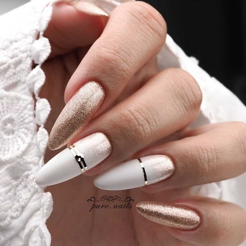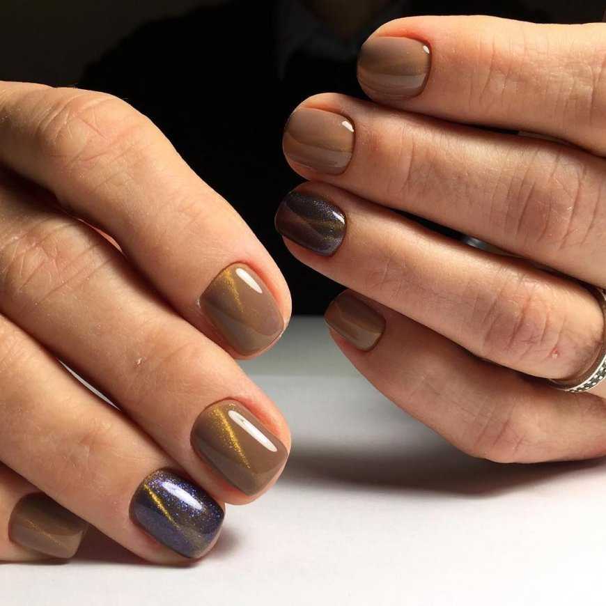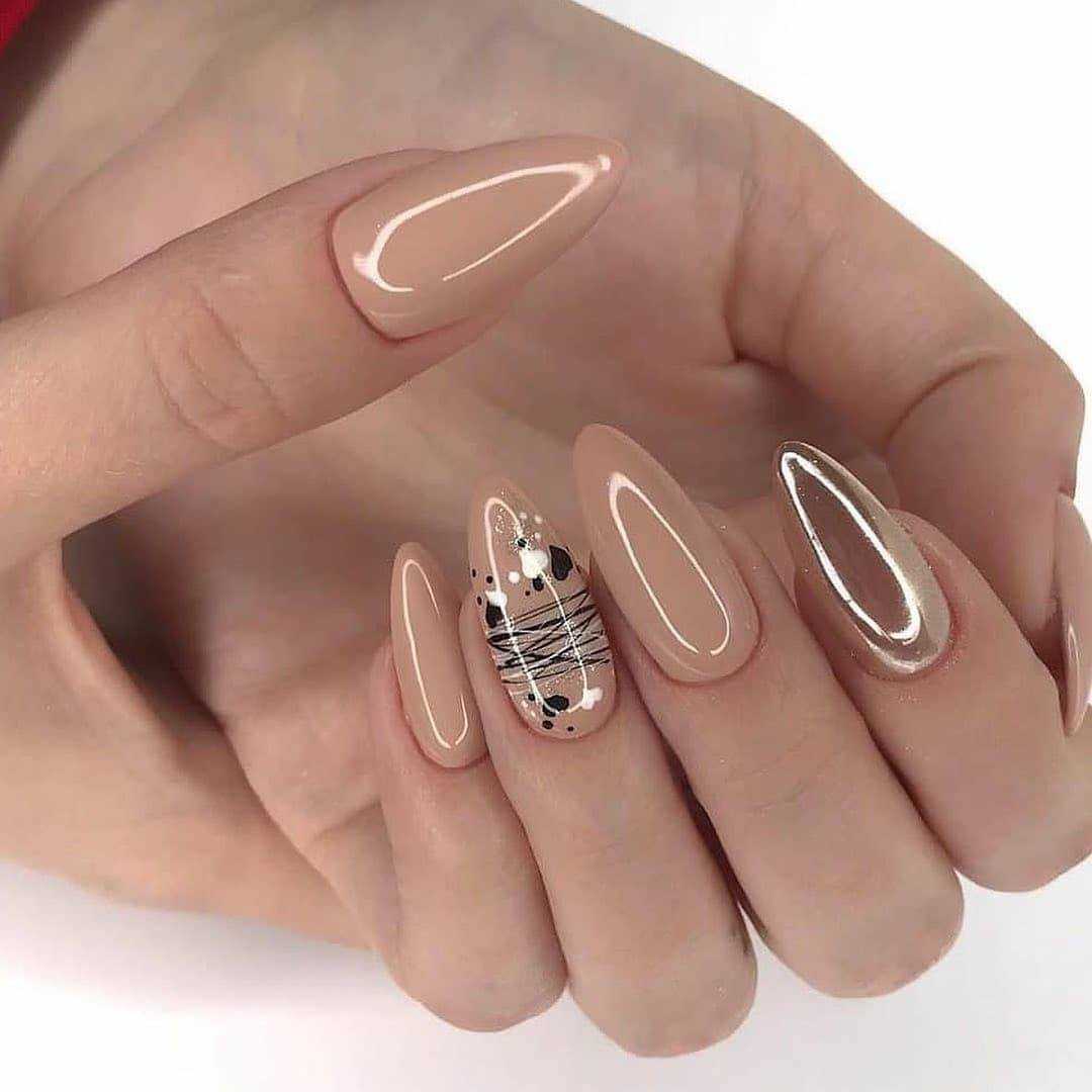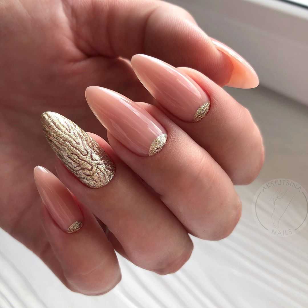Нюдовая палитра подходит на каждый день и на праздник и шикарно сочетается с акриловой пудрой, блёстками, геометрией.
