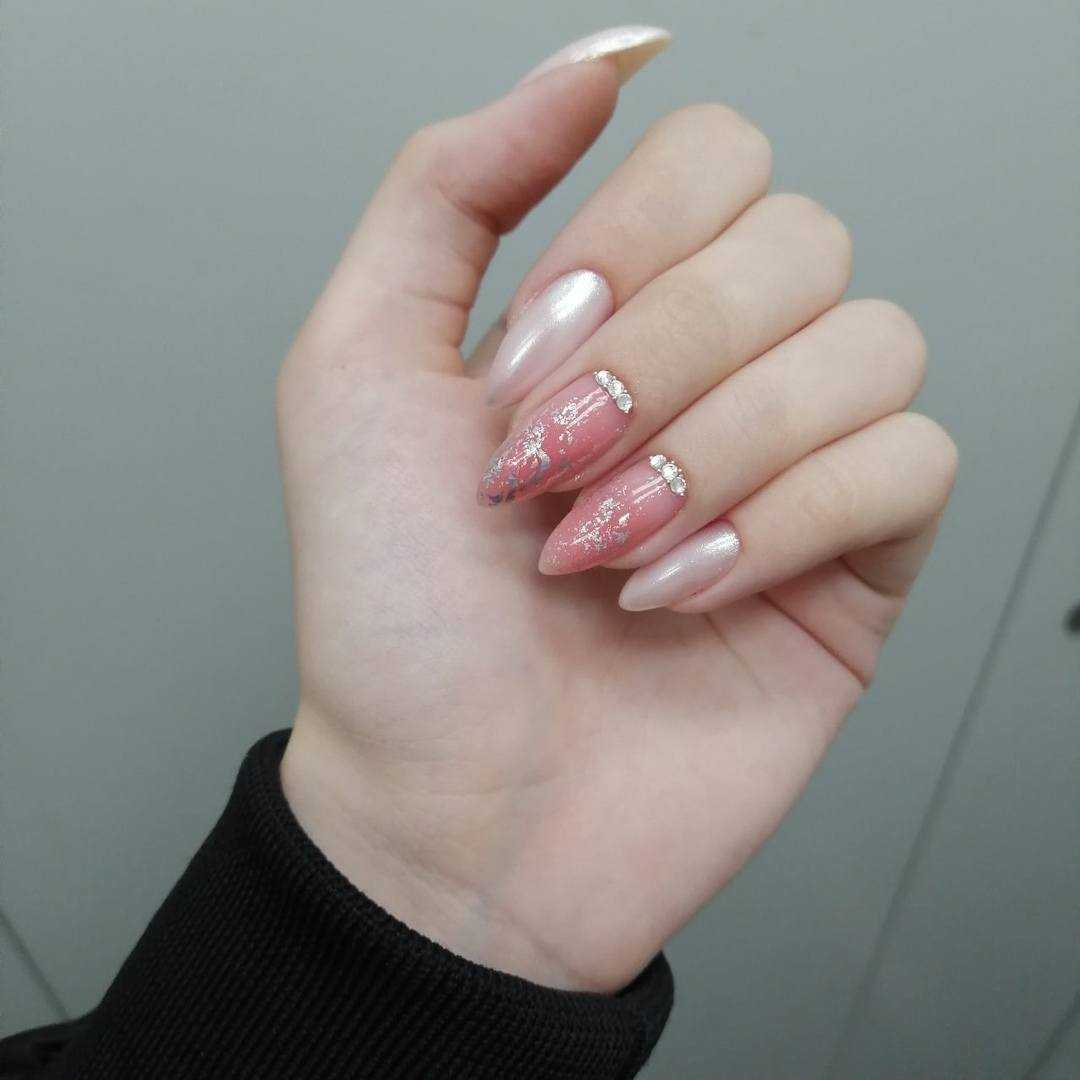 Для получения уникального дизайна используют кусочки фольги, которыми декорируют один ноготок на каждой руке.