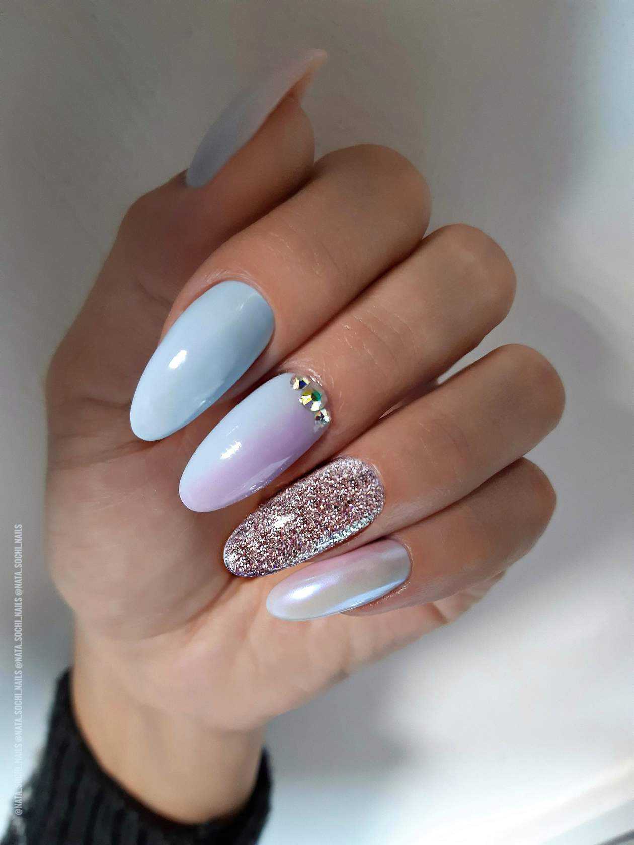 Голубой нежный цвет ногтей, сочетающийся с привлекательными стразами, имеет поразительный вид. Можно выбрать симпатичные пикси приятного оттенка, способные заиграть яркими красками, сочетаясь с россыпью камней над голубыми покрытиями разных оттенков.
