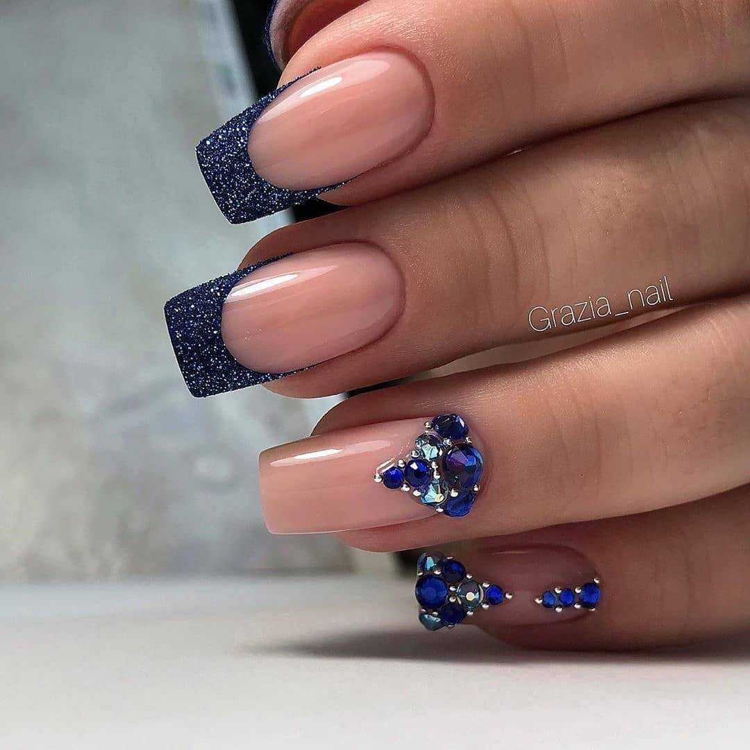 Возможно выделение лунок с помощью стразов либо покрытие всего пальца камнями, благодаря которому будет создан мягкий орнамент для праздника в голубых тонах, который подойдёт, к примеру, на выпускной.