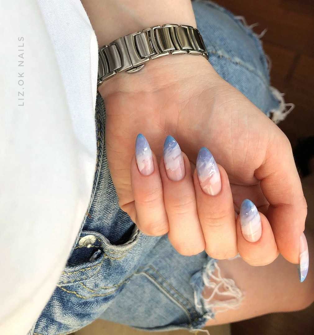 Изюминкой такого шикарного оформления являются еле заметные светлые линии. Градиент розово-голубого маникюра выглядит нарядно и выразительно.