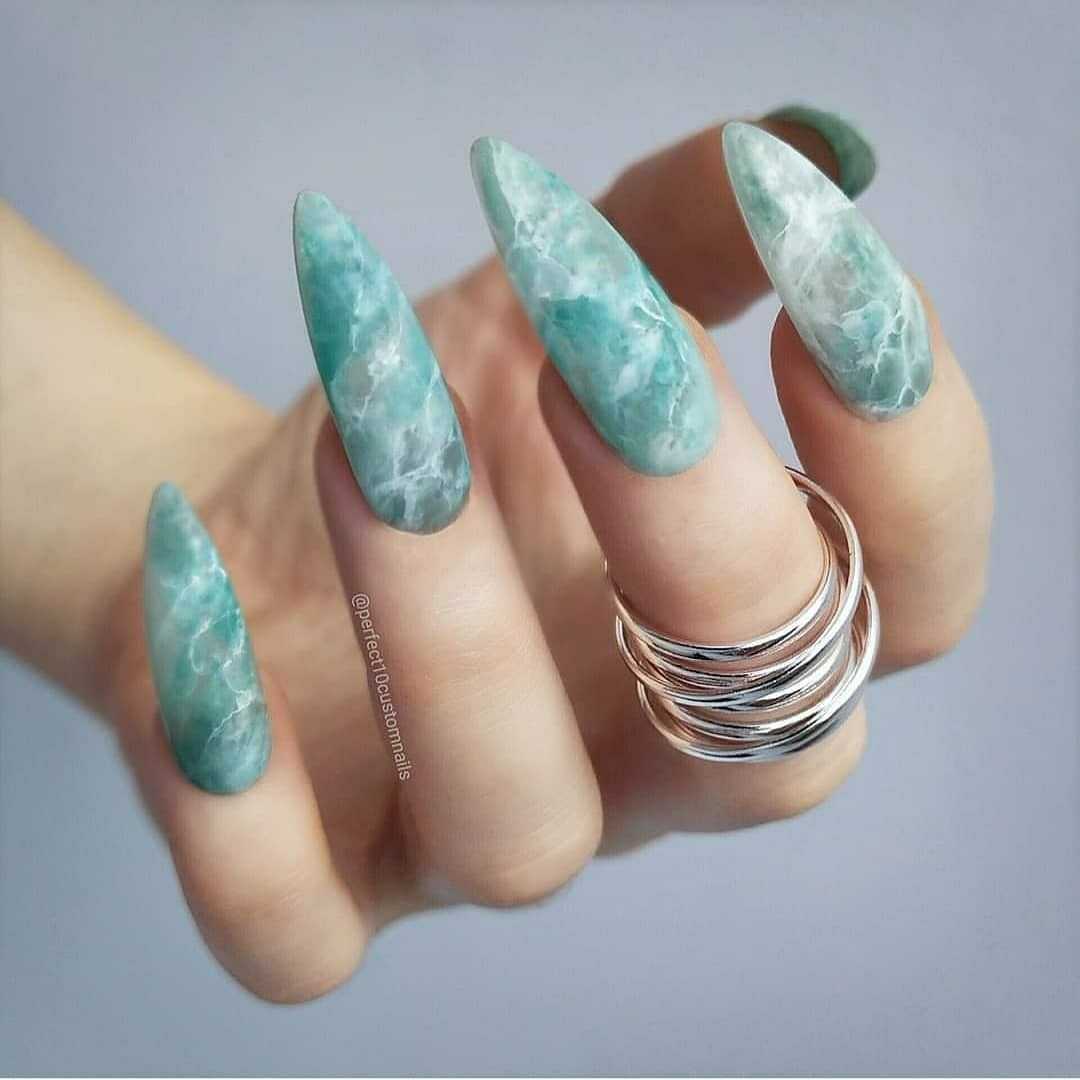 Для ногтей большой длины подходит равномерный тон, который может быть бледно-голубым либо ярким, интенсивным, вызывающим внимание. Сейчас в тренде миндалевидные ногти. А их дизайн ограничен только фантазией обладательницы ногтей и профессионализмом маникюрщика