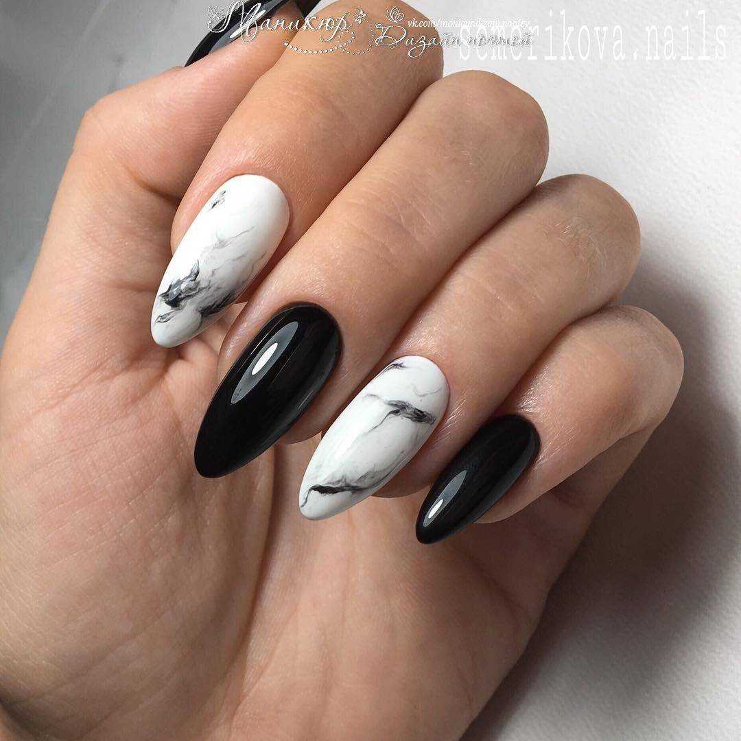 Стильно выглядит матовый гель лак в дуэте с белым мраморным дизайном на отдельных ноготках.