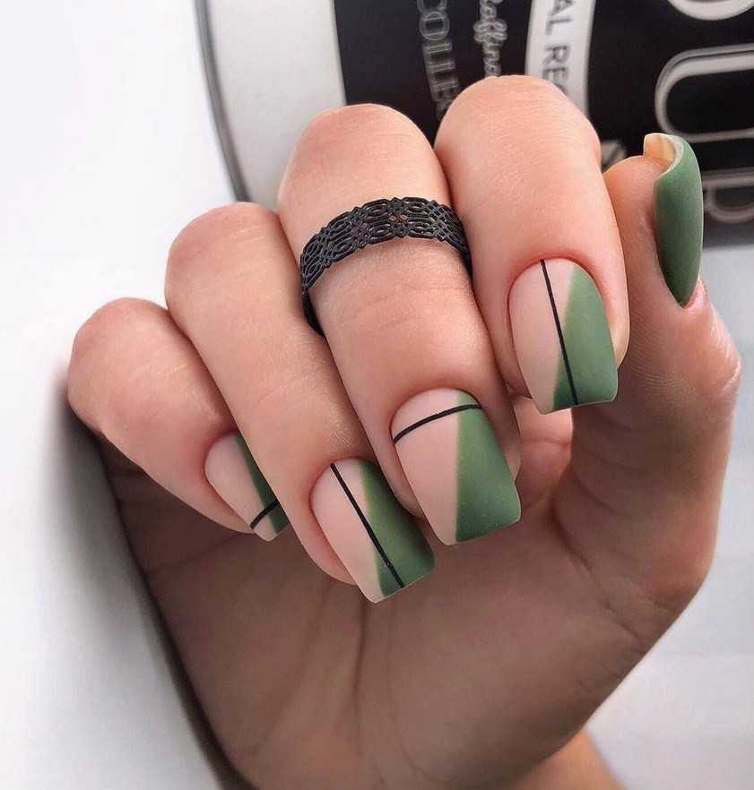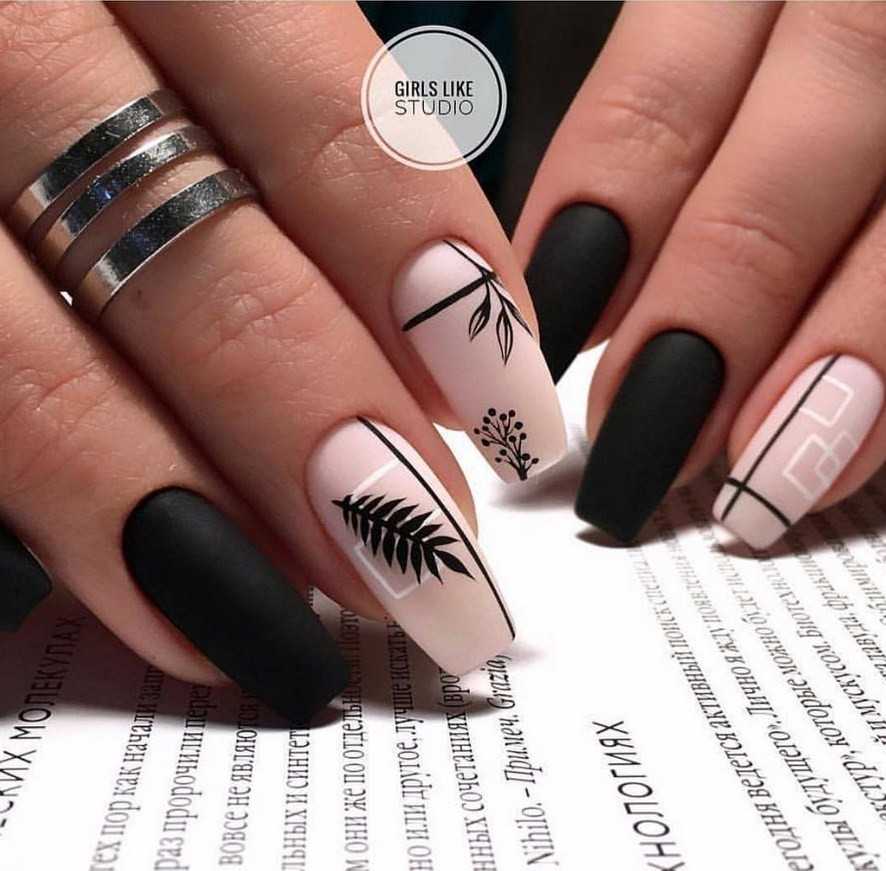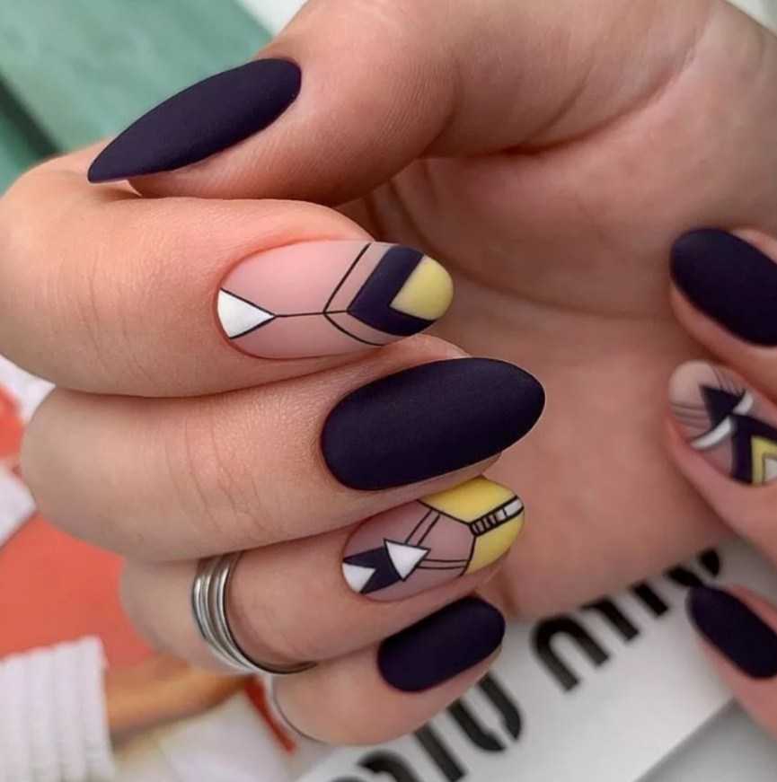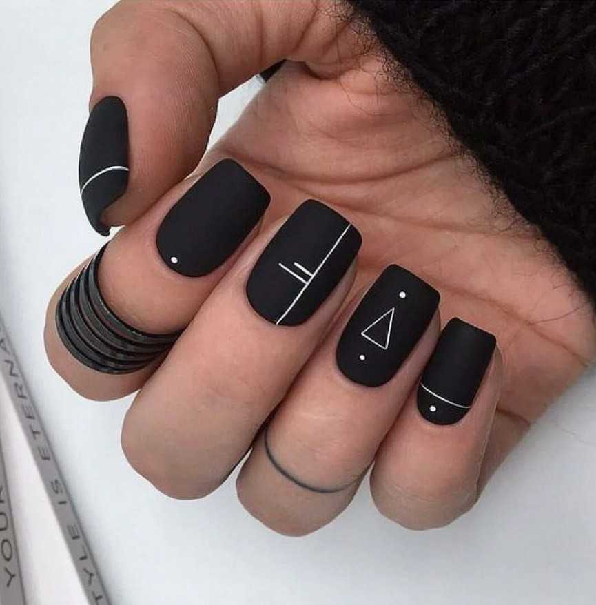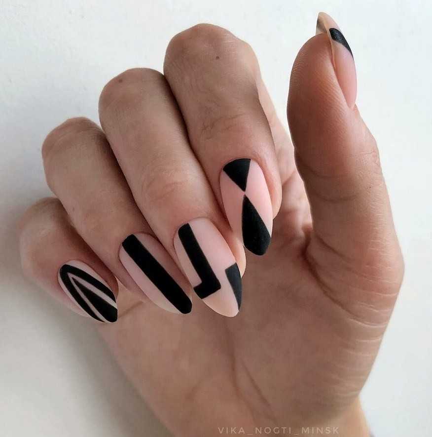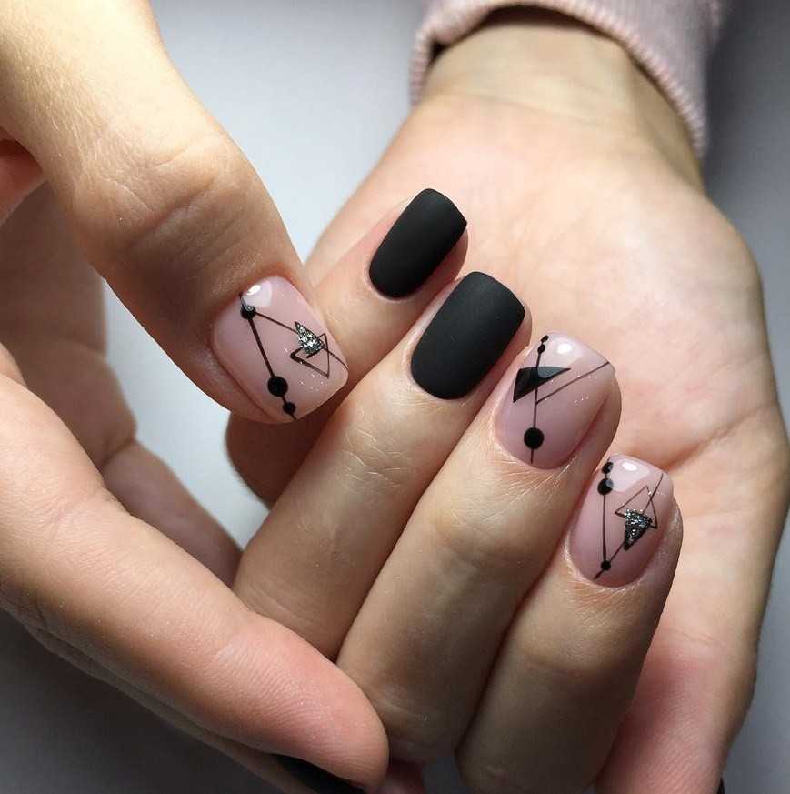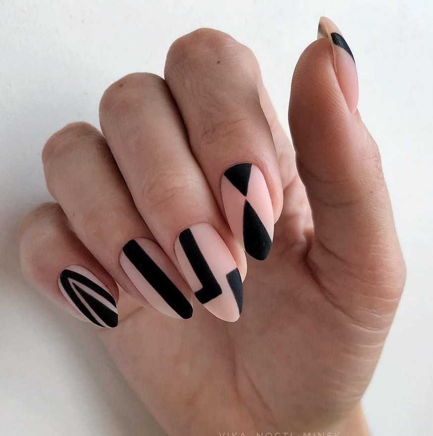 Выразительный томный дизайн. Он элегантен и оригинален. Здесь подойдёт любая идея. Матовый маникюр с геометрией — это высший пилотаж. Настолько он интересен.