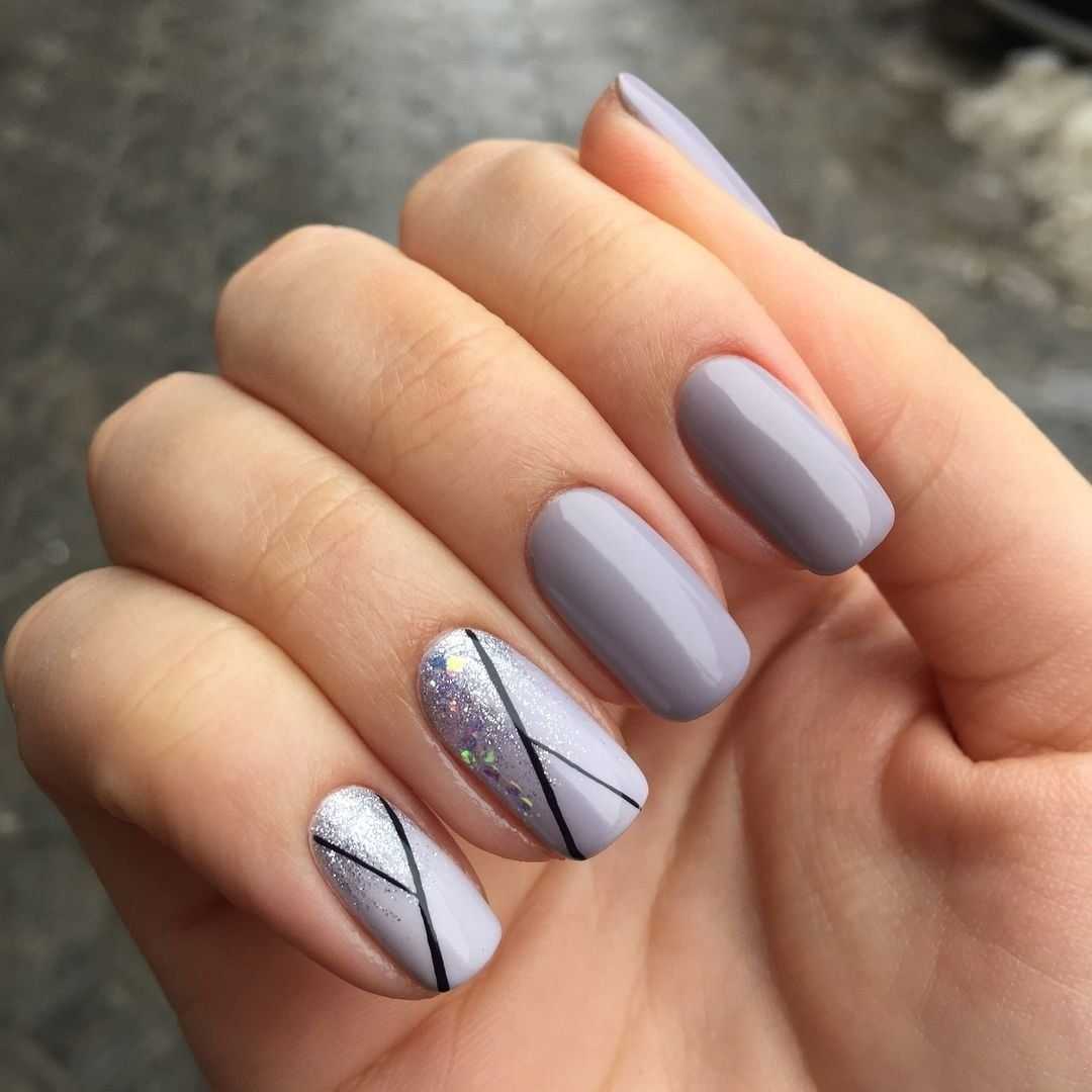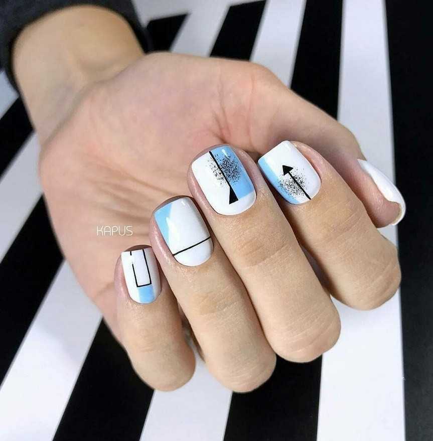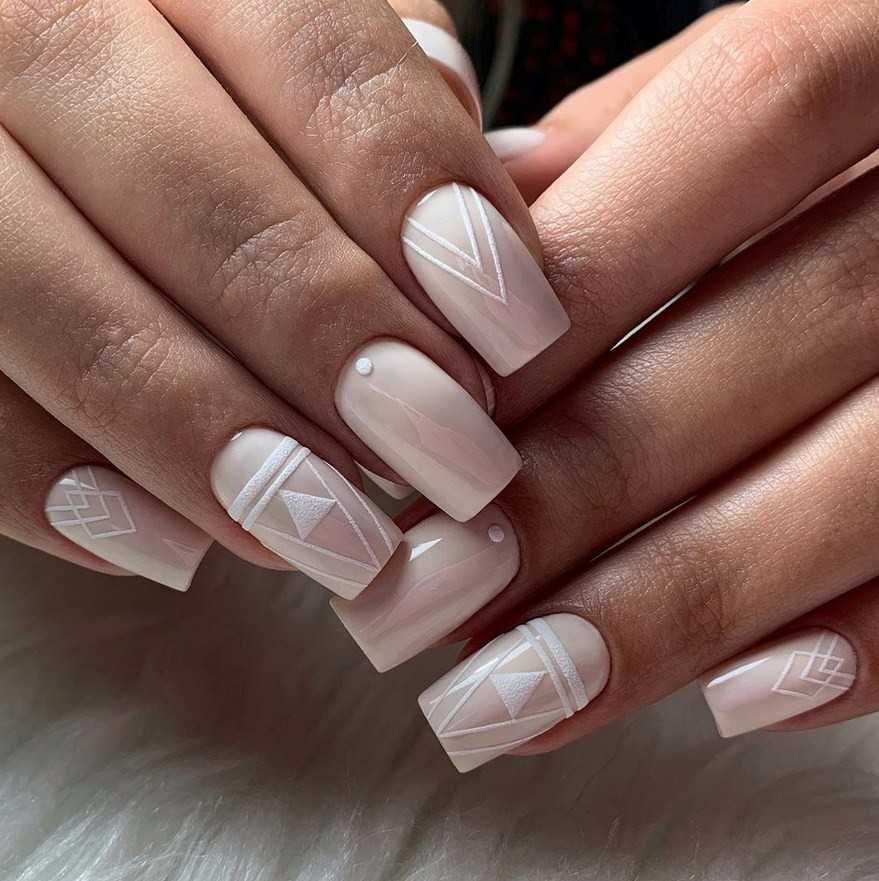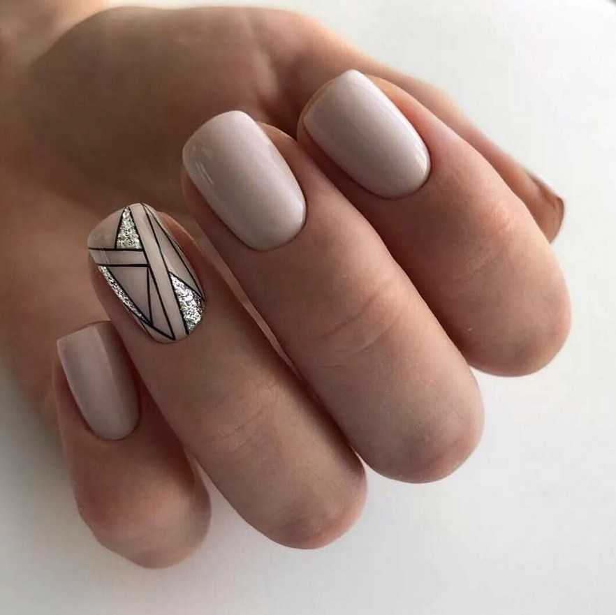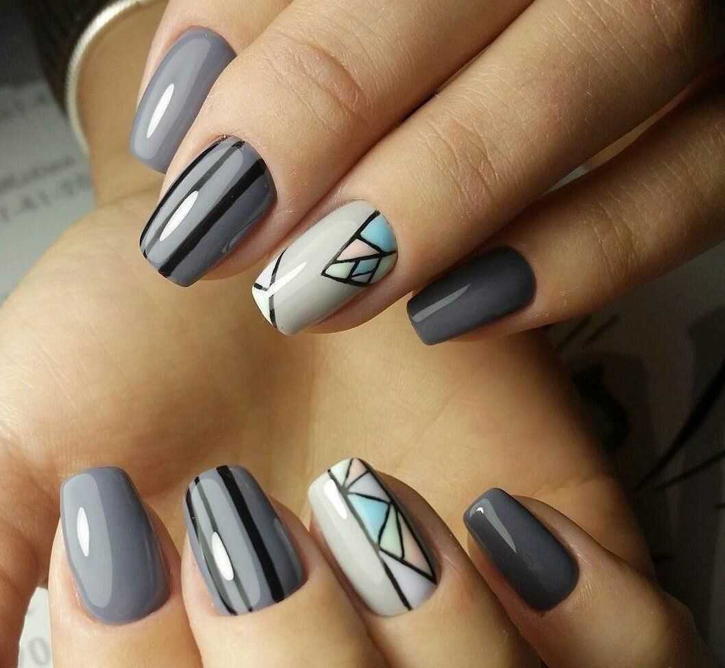 Отличный вариант для абстракции. Такой маникюр создаёт стиль. Для геометрии берут светлые оттенки — белый, серебристый, серый или беж.
